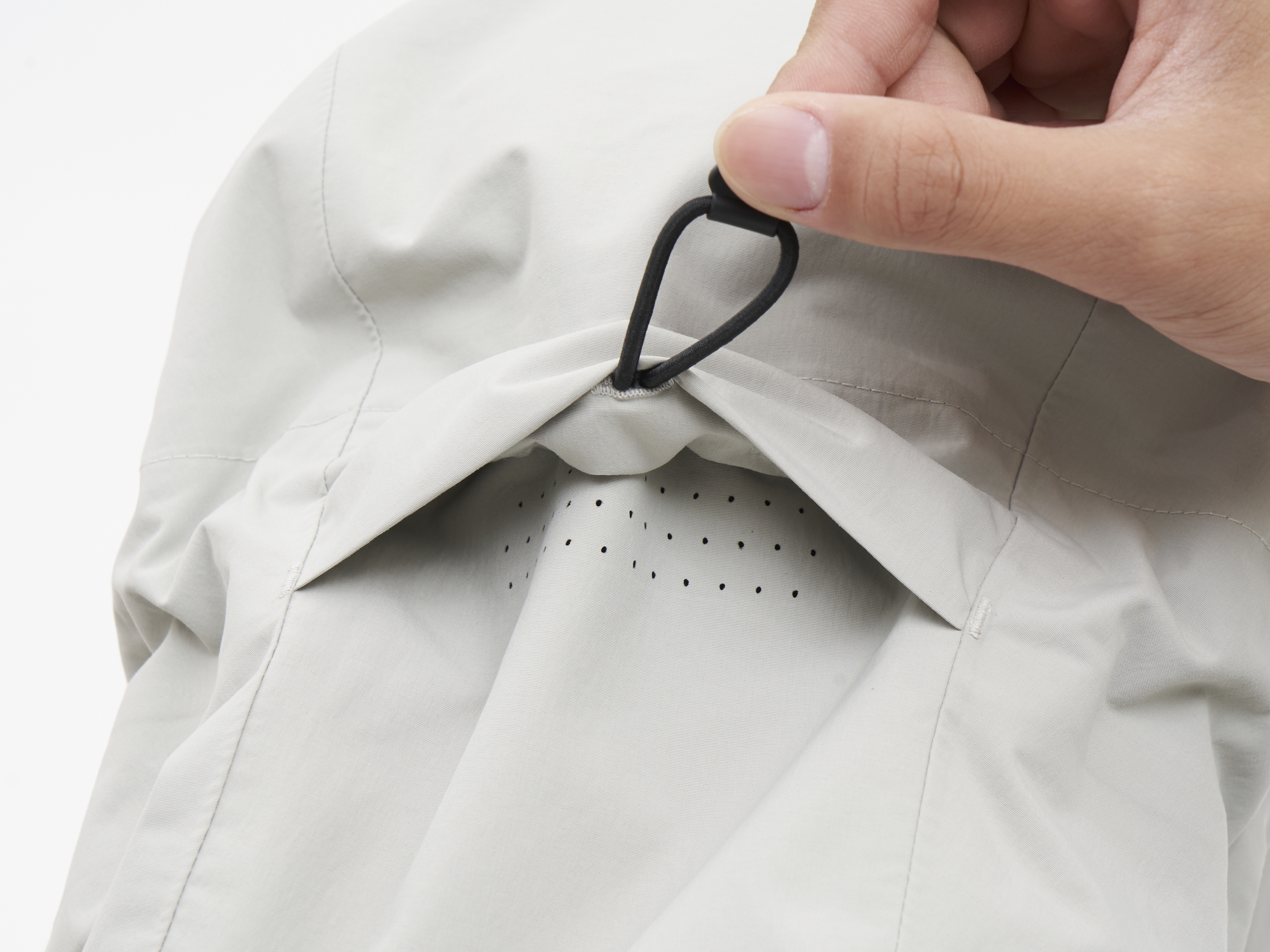 フード内の通気性をアップし、頭部の蒸れとフードのバタつきを軽減します。