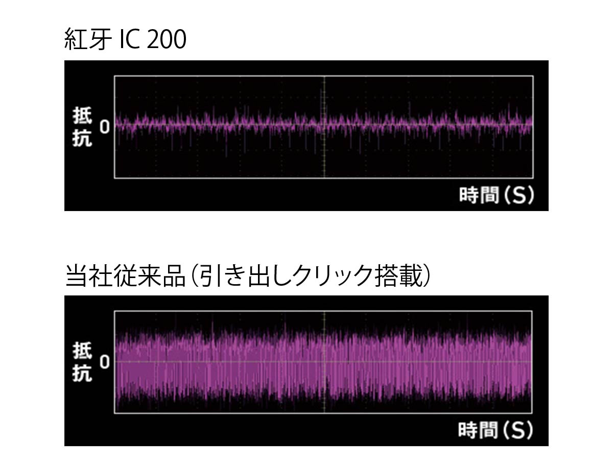 上記グラフは、ドラグ引き出し時の「抵抗」を比較したグラフ。紅牙IC200は、この「抵抗」を大幅に低減したことで、より滑らかな高性能ドラグを実現。調整範囲を拡大したドラグとの相乗効果で、細糸ラインを使用時にも安心したやり取りが可能となる。