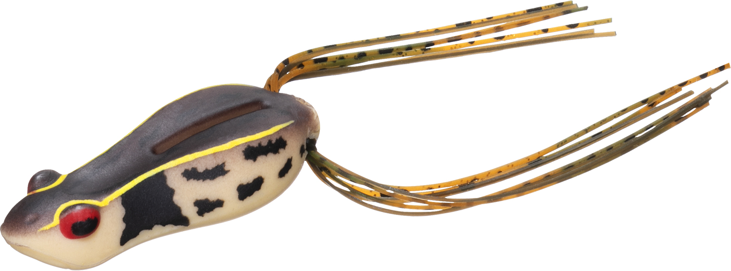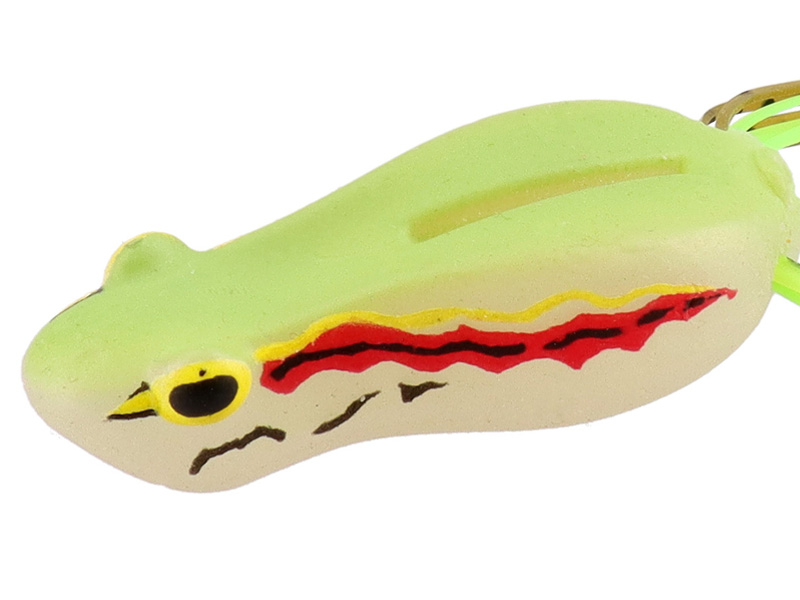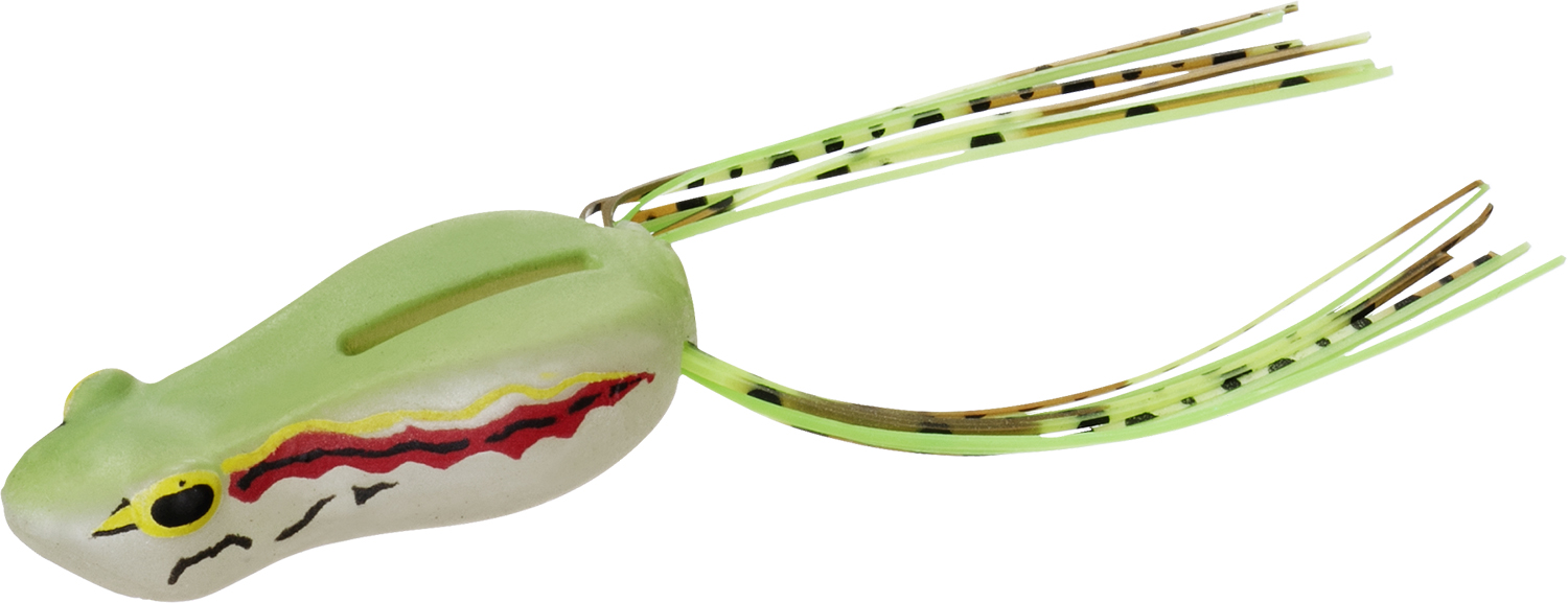梅田京介監修。フローティングのエラストマー素材を採用したオフセットで使うフロッグ。通常のドッグウォークから高速ドッグウォークまで幅広く対応し、カエル以外にエビやベイトフィッシュなども演出可能。長めに設定されたラバースカートがアクション時にブレーキの役割を果たし、短い移動距離で誘うことも可能。後方重心のボディは遠投はもちろんカバー奥へのスキッピングでも威力を発揮する。オフセットフックをセットしやすいフックセットアシストマーカーも搭載。初心者でも扱い易い。