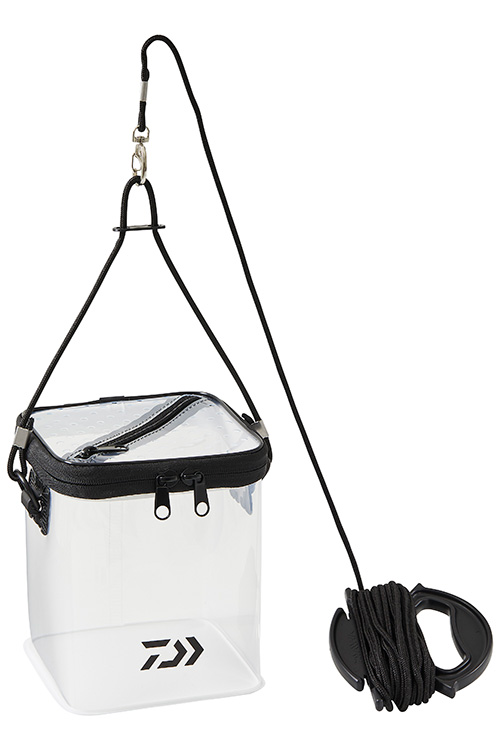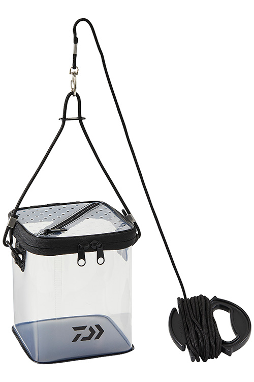 魚が飛び出しにくいメッシュのフタ付きで、水を汲む際に取り扱いやすいコンパクトなサイズ。折りたたむことも可能。また、魚を観察しやすいクリアなカラーで、使いやすいように巻き取りやすいからまんホルダーと8メートルのロープが付属しています。