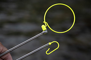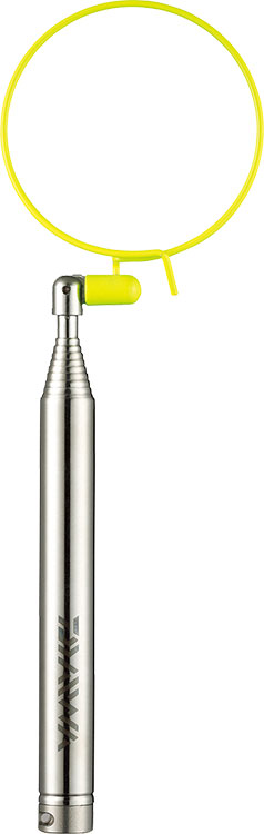 水中で見やすい蛍光イエローカラー先端。シャフト部にスリット加工をする事で水圧(流れ)によるシャフトの回転がしにくく、根掛りトラブル解消に便利。鮎ベストの胸ポケットに収納可能(胸ポケットのサイズにより収納できない場合がある)。スプリットリングを尻手ロープ穴に通せば、紛失防止の尻手ロープの取り付けが可能。またカラビナを取り付ければベストのDカンにも取り付け可能。
