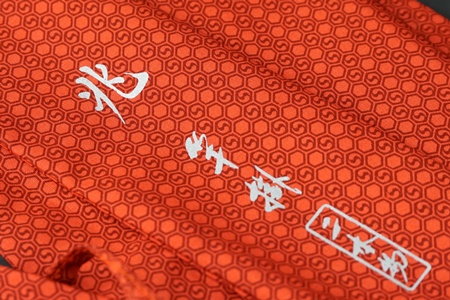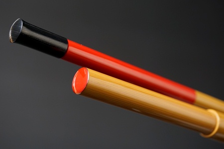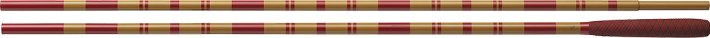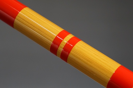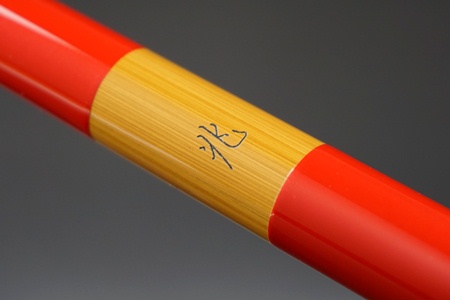 1本1本個性の異なる手拭き仕上げの竹地に、光によって微妙に色合いが変化する「兆」と同仕様の朱段塗り。