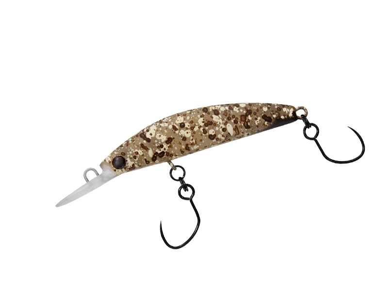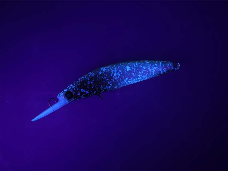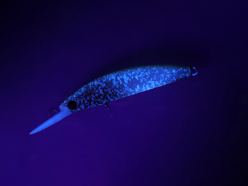 カゲロウベージュ | トラウトの餌であるカゲロウをイメージした半透明のカラー。ケイムラを飛ばしで塗装することで紫外線により粒状に発光してトラウトを誘う。 |