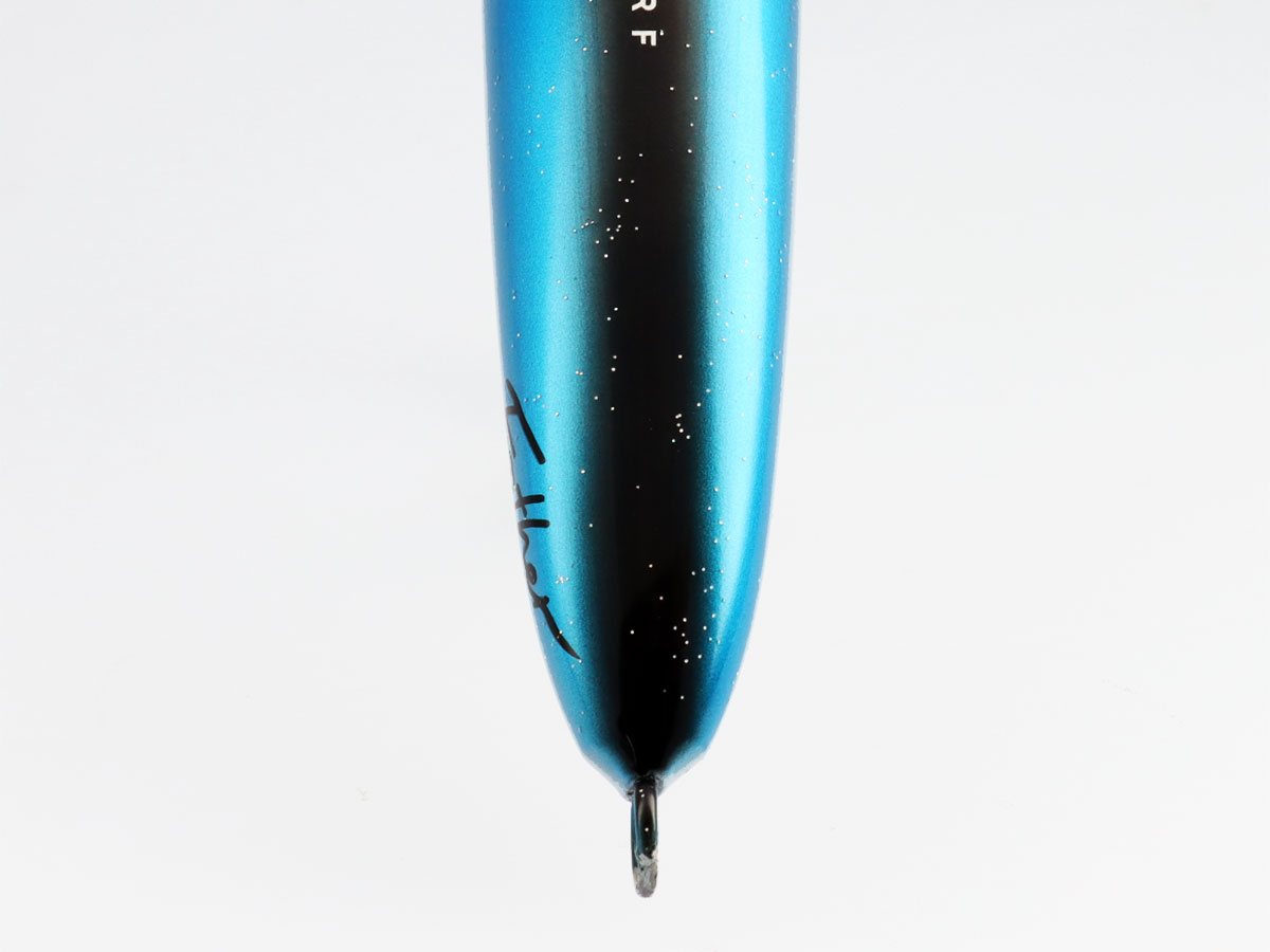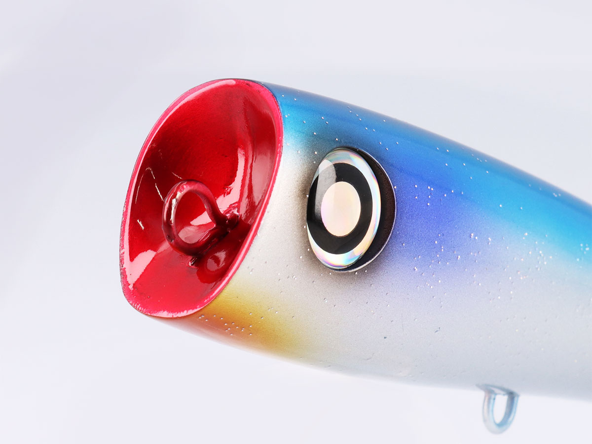ソルティガフロッサーはきめ細やかな泡を纏い、魅惑のポップサウンドを奏でながら水中の魚を魅了するポッパーである。カップ上部は泡を噛みやすい様、深めに設定し、下部は浅くし、泡をたてられるような形状とした。それにより、リトリーブ時に深く潜りすぎず、水面直下を細かな泡と共に泳ぐ。また、ポッパーは高浮力タイプが多く、浮力を保つために沢山のウエイトを積めないが、ソルティガフロッサーはギリギリまでウエイトを積み、また、横風を受けた時にバランスを崩しにくいフォルムで飛行姿勢を安定させ、飛距離のアドバンテージを確保した。水中での浮き姿勢は垂直浮きで、一回目のジャークで潜りすぎず、レスポンスもよくなる。直線的でレスポンスの良いポッパーなので、リズミカルにテンポよく、まるでダイビングペンシルを扱えるポッパーである。