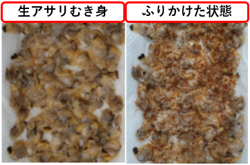 右の画像が本製品を振りかけて約10分後。アサリ身が締まっている。