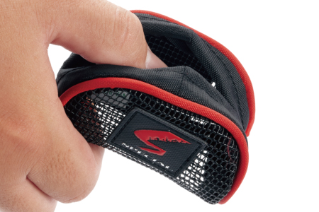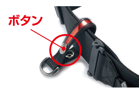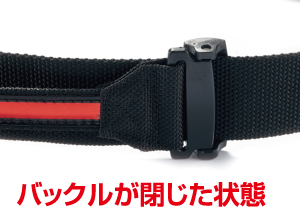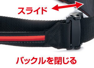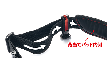 5.余ったベルトの端を背当てパッドに入れ込んで、元の状態に戻す。最後に、外した速攻オモリポーチを取り付け、Dカンの付いている留め具のボタンを確実に留め、スイングバックルをはめれば完了。