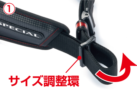 3.ベルトを短くする場合は、サイズ調整環でベルトを写真1のように赤色矢印の方向へ引っ張る。