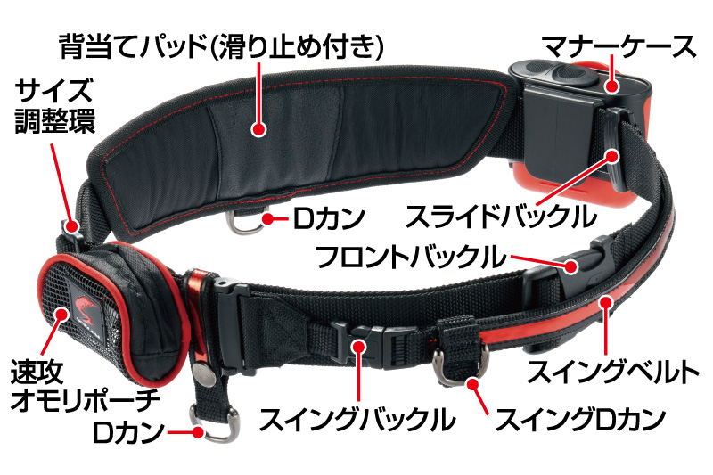 マグネット開閉式ですぐにオモリが取り出せる「速攻オモリポーチ」、ちょっとしたゴミ等を入れられる「マナーケース」を標準装備。