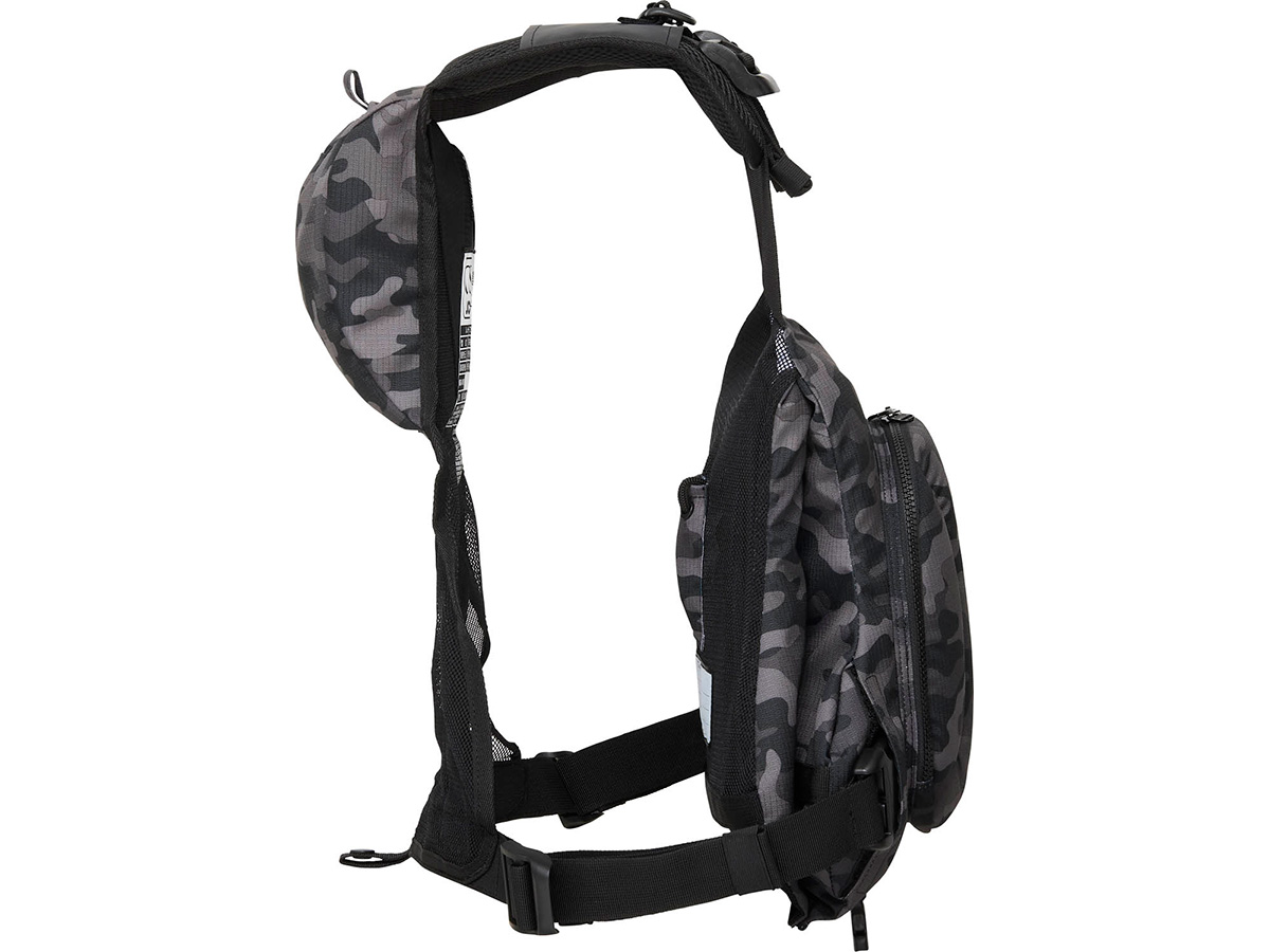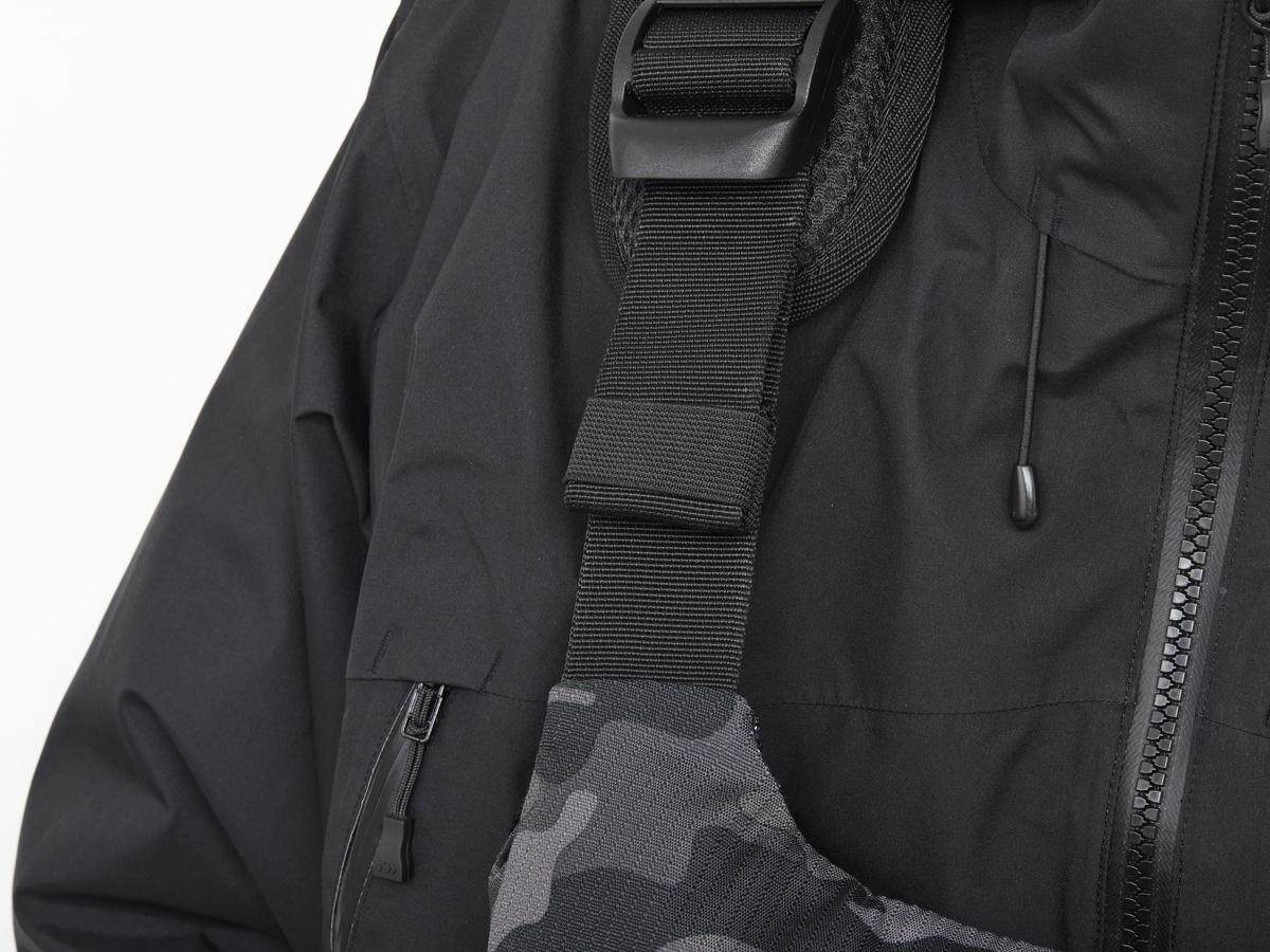 着用状態からサイズ調整がし易い前引きタイプの調整ベルトを肩と脇に配備。落水後に再乗艇する際にベストの各種パーツが干渉しないようにテープの余り部分などをまとめて置ける仕様設計。