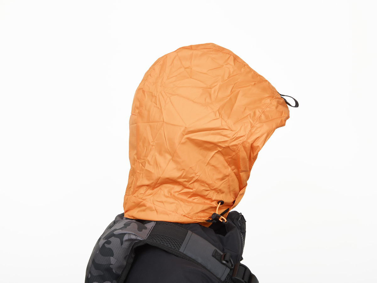 万が一の際には視認性に優れたエマージェンシーフードを背面に格納。着用状態のまま背面から引き出し着用が可能。