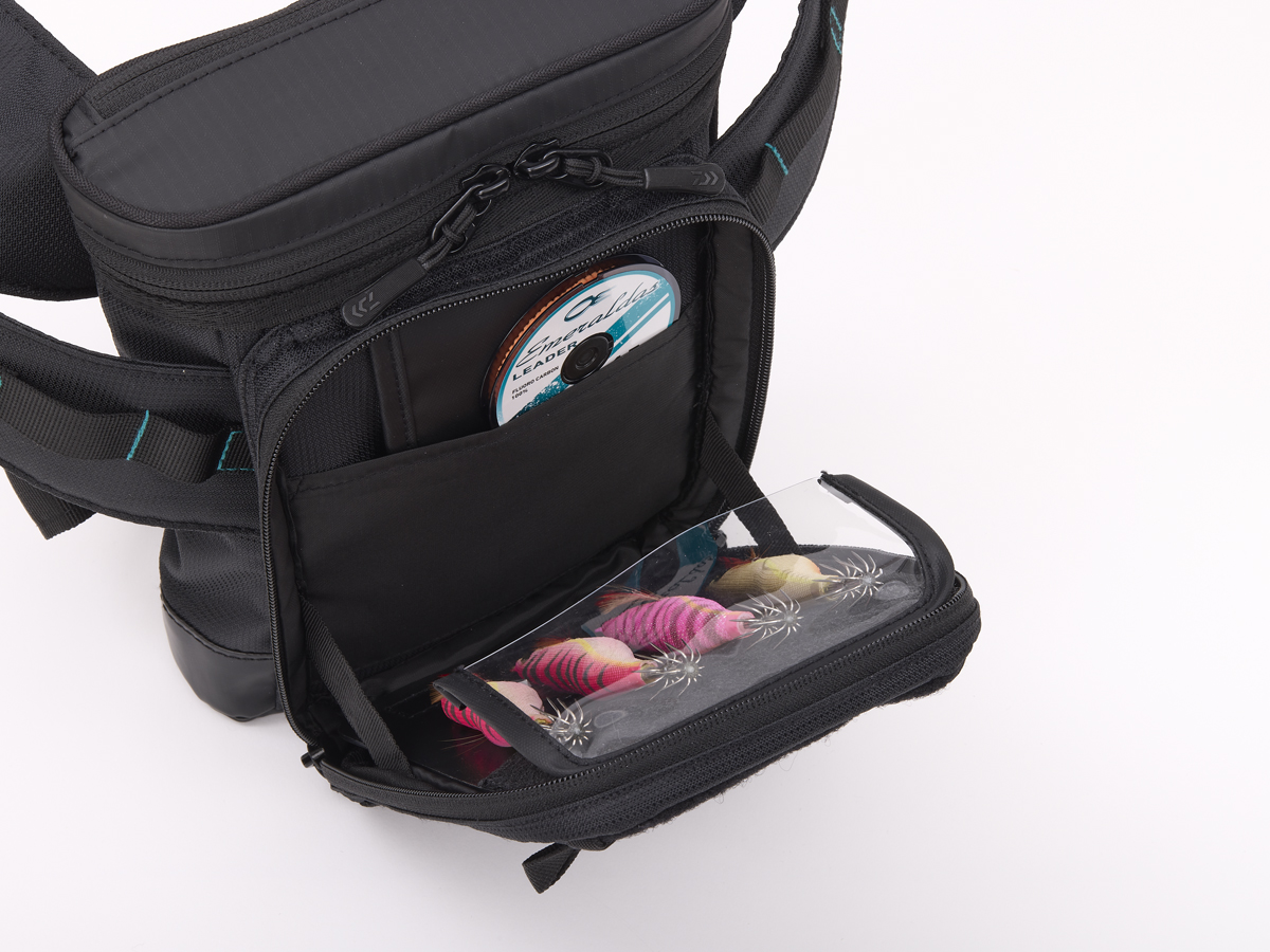 交換用のエギを収納しラクラクチェンジ!マット付きポケットの開閉を容易にする仮留めフラップ付き。