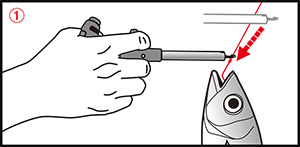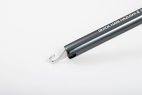 ①ハリハズシのパイプにハリスを当てて、フック側に滑らせると、自然にフックに糸がかかります。(深く飲まれたハリは外せません。)