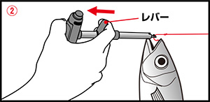 ②フックがハリに掛かったら、ハリハズシとハリスを一直線にし、レバーを引きます。