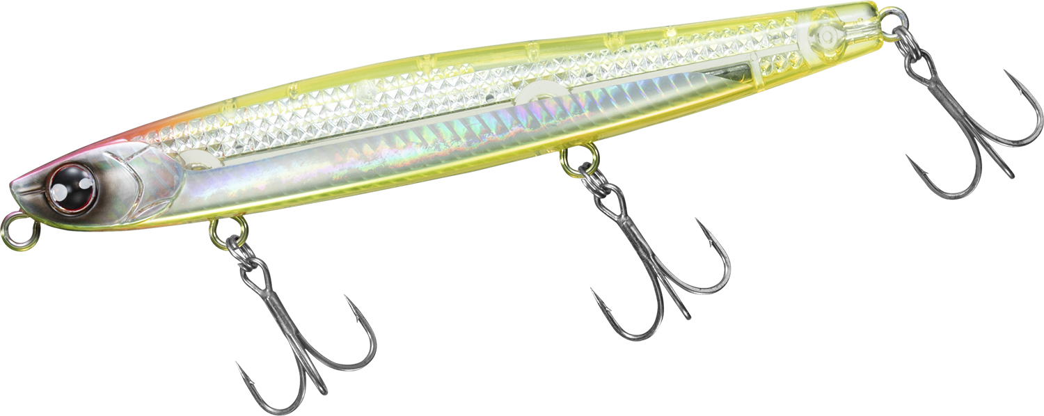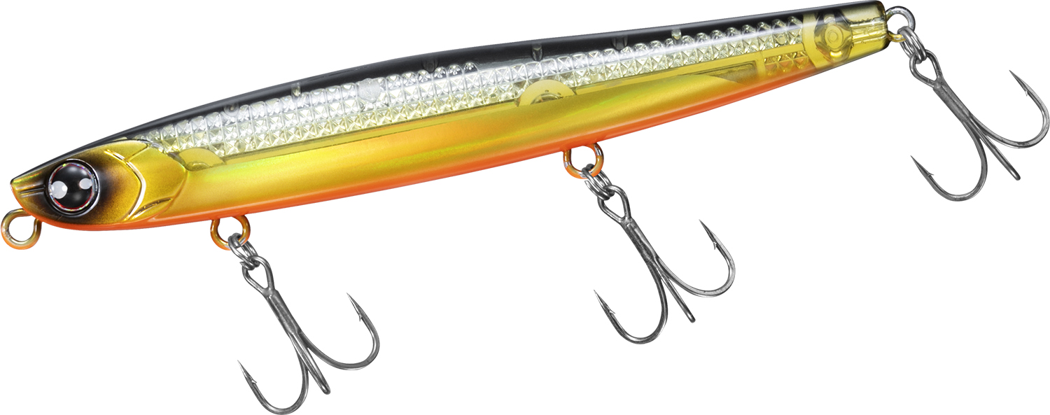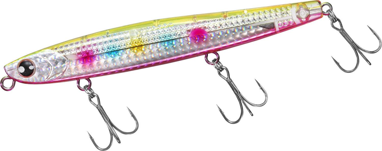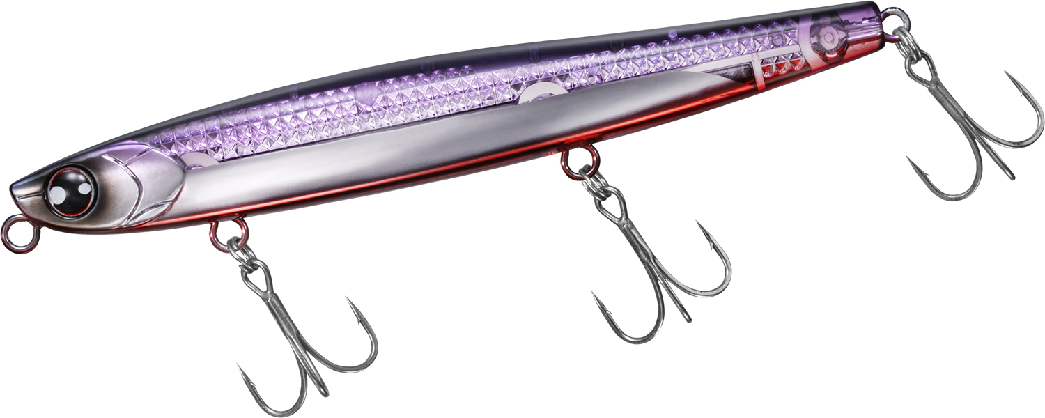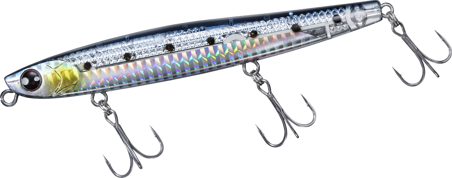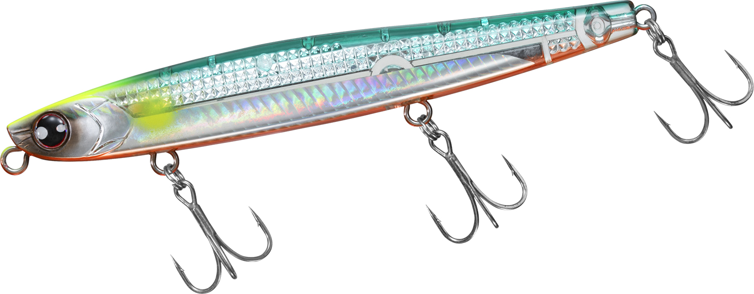 128mm/45gで何も抵抗のないスティック形状のボディは飛行姿勢もブレることなく遥か彼方に飛んでいく。向かい風、横風、爆風など荒天下においても誰でも簡単に遠投が可能。低重心+ボディ後半を太くすることで「とにかく飛ぶ」ヘビーシンキングペンシルに仕上げた。