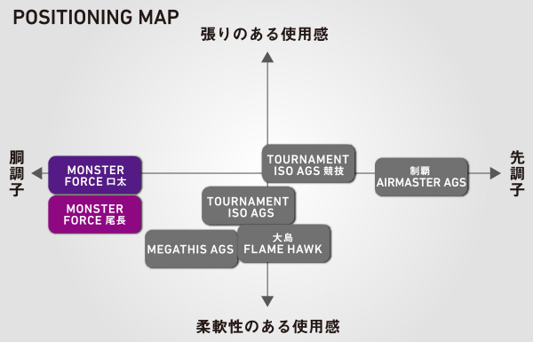 尾長モデル | 60cm以上のモンスター尾長に真っ向勝負を挑むパワーアイテム 獲るための第一関門はいかに最初の猛進を止めるかにある。尾長モデルは根へ突っ込むモンスター尾長を腰ダメのファイトスタイルでガッチリと曲げ込み、強いテンションを掛け続けながら、最後の締め込みに対しては元部の硬さで止める絶妙な曲がりバランスを追究して開発。 安心感を持って曲げ込みながら、最後は使い手の微妙な感覚での調整域を設けることで限界域でのマニュアル感がやるか、やられるかの攻防を制する。 |