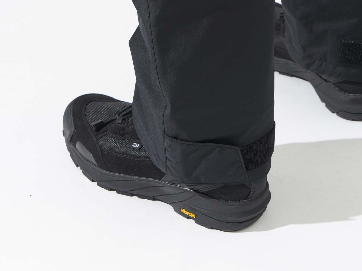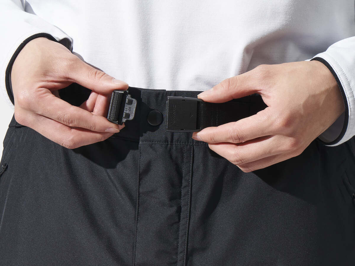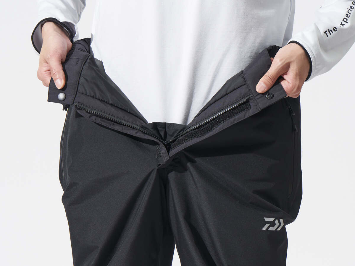 袖口からの浸水を軽減するカフスを内袖に搭載し、衣服内の濡れを最小限に抑える。パンツはバックル付き調整ベルトが搭載され、ずり下がりにくい仕様。