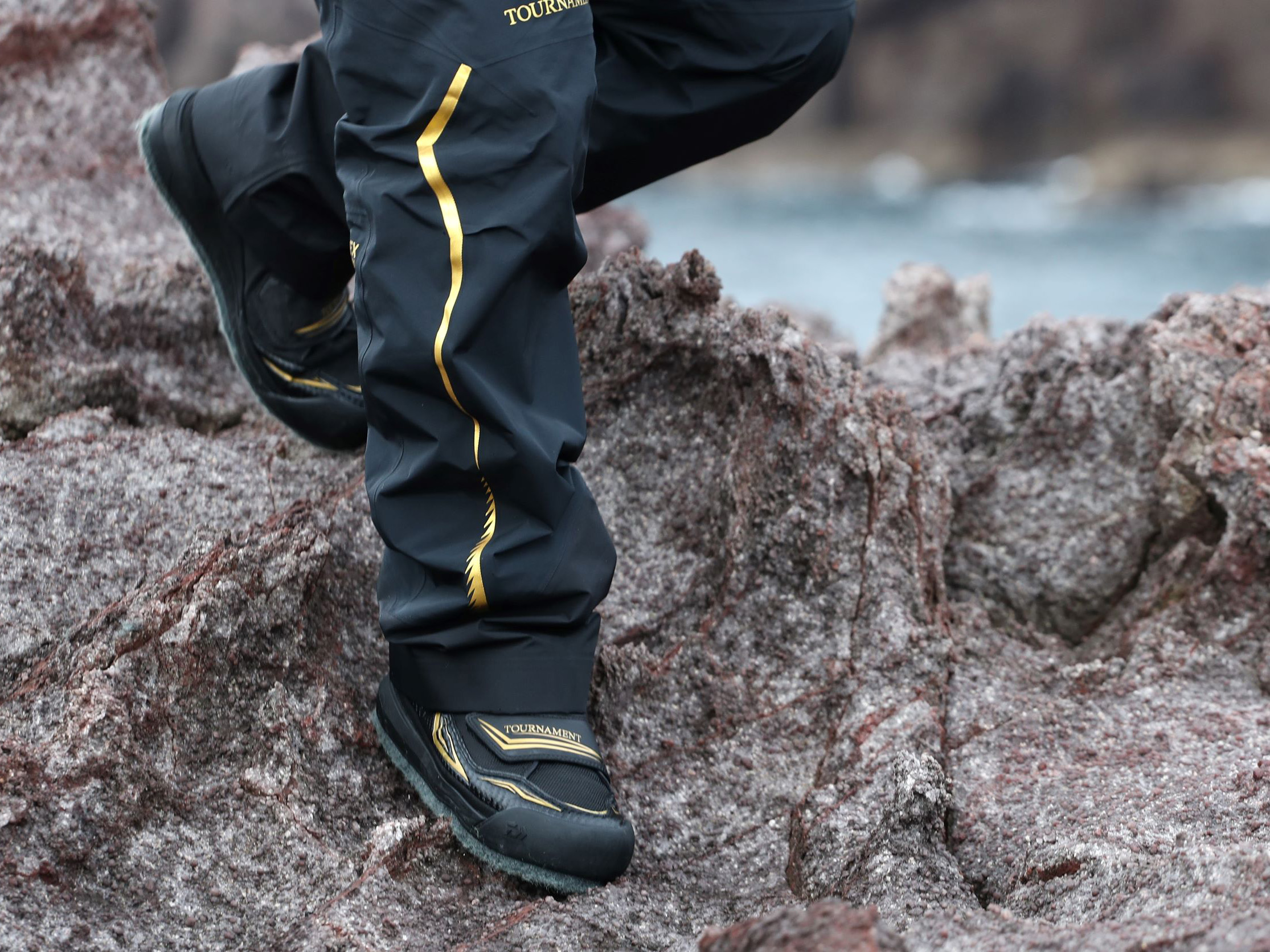 しかし、ゴアテックスプロダクツを製品で使用するにあたっては、WLゴア&アソシエイツ社の厳しい品質基準をクリアする必要があります。ダイワもこれまで、レインウエアやウインタースーツではゴアテックスプロダクツを採用した製品を数多くリリースしてきましたが、ここにきてシューズにおいてもようやくゴアテックスを採り入れるに至りました。『トーナメント GORE-TEX シューズ』は、ダイワでは初となるゴアテックスプロダクツを用いた磯用フットウエアです。
