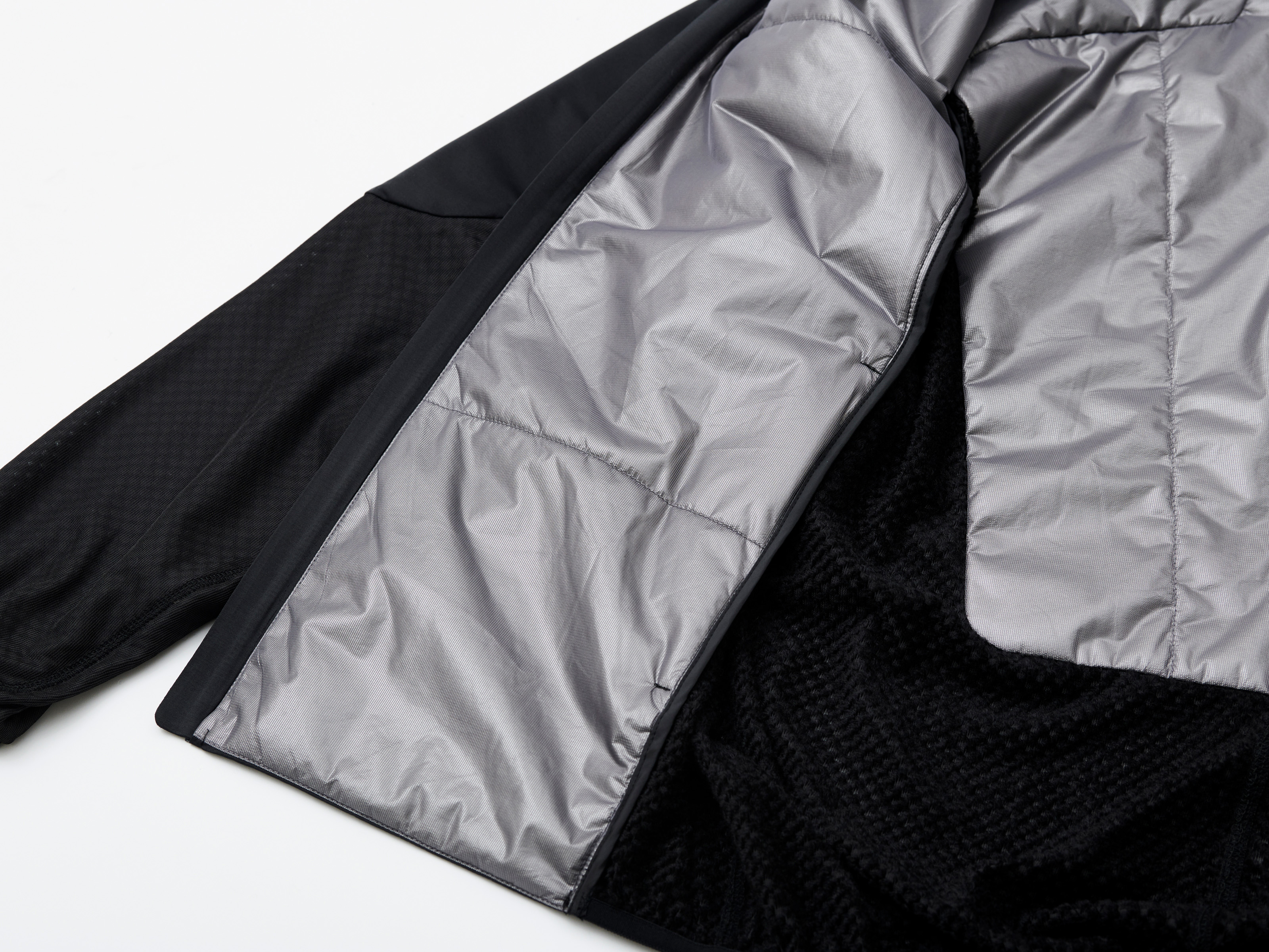 中綿と遠赤外線裏地で身頃を暖め、脇下や腰等蒸れる箇所は通気性と保温性を兼ね備えたサーモフライ素材を採用。