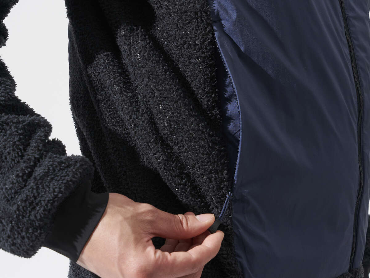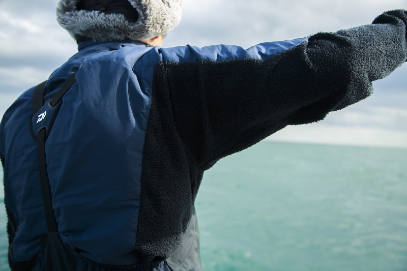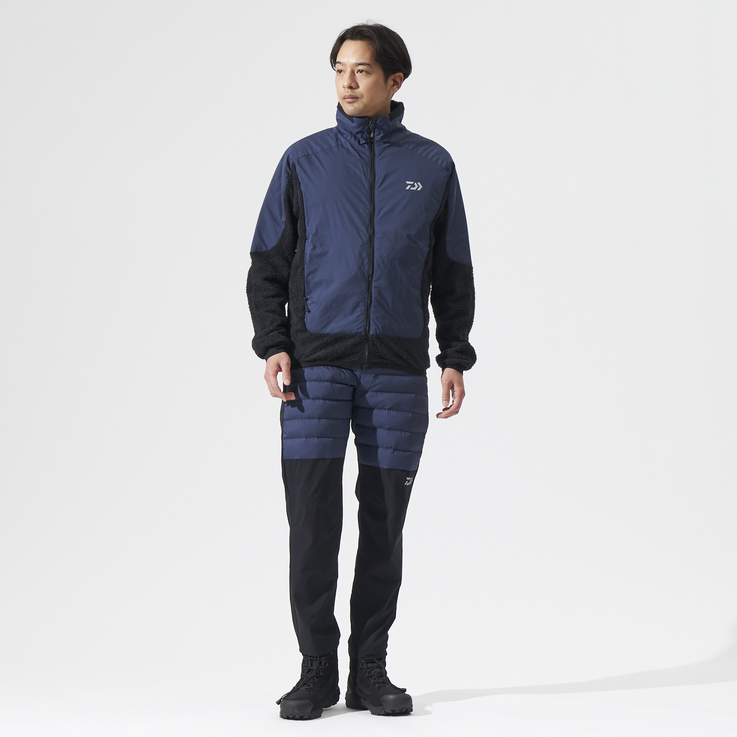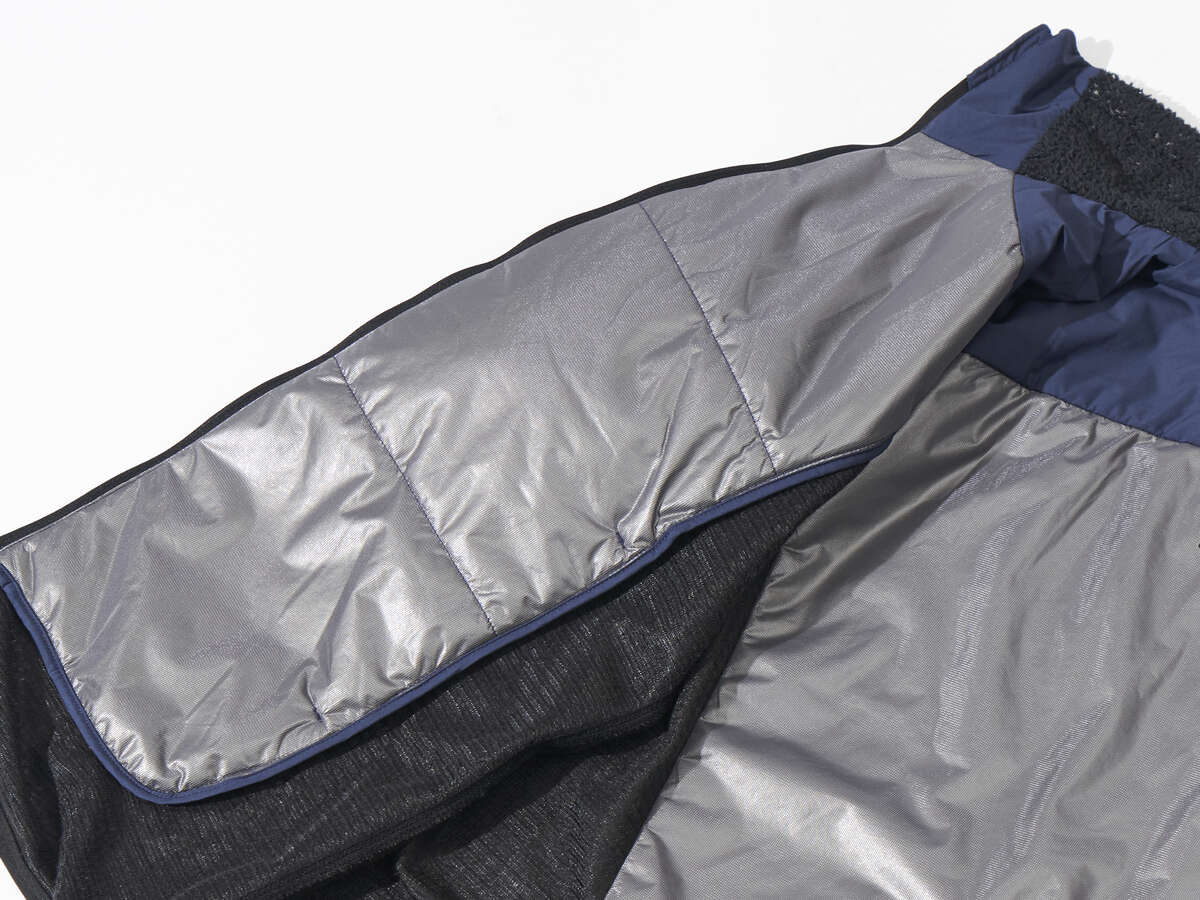 レインウエア等のアウターとのレイヤリング想定した、ハイブリッドジャケット。適材適所に異なる素材を配置し、軽量かつ効率的に身体を温める設計。中綿には遠赤外線を発するダンロテック素材、裏地には部分的に体温を跳ね返す効果のあるアルミを含む素材使用。重ね着やしゃくりの動作などで蒸れやすい脇や、ライフジャケット等と重なりやすい腰部には通気性のあるフリースを採用。さらに袖口には冷たい水を吸い上げにくいよう、撥水ストレッチ素材を採用。