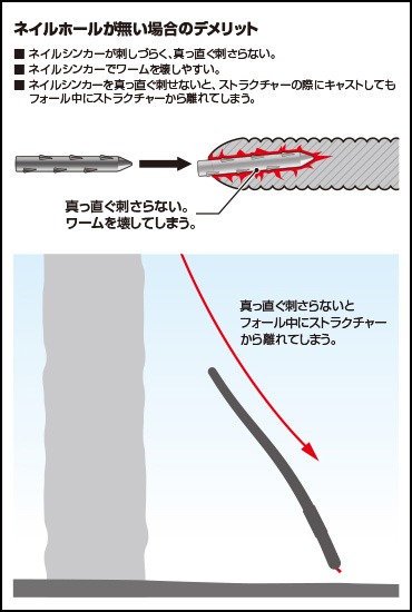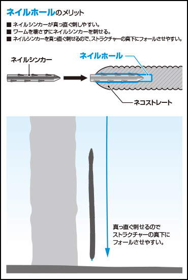 STEEZネコストレートには、ネイルシンカーを快適に使用するための“ネイルホール”が搭載されている。ヘッドの先端に極細の穴が開いており、ネイルシンカーを真っ直ぐキレイに刺しやすい。また、刺しやすいだけでなく、抜けにくいのも特徴。従来のワームでは、ネイルシンカーを刺す時、ワームを破壊しながら入れていくしかなく、ワームがダメージを受け、キャスト時などにネイルシンカーだけが抜け落ちてしまう。ネイルホールがあれば、ワームのダメージを少なくできるので、抜けにくく、シンカーのウエイトチェンジも可能となっている。よりタフな状況下では、0.5gのウエイトチェンジでバスの食いが変わることもあり、シンカーのウエイトチェンジをスピーディーに且つ、真っ直ぐ刺せることは、大きなアドバンテージとなる。