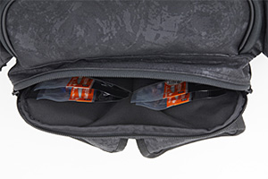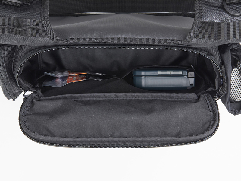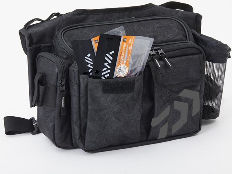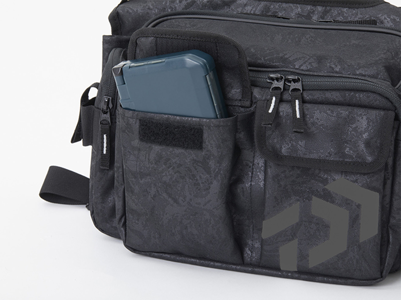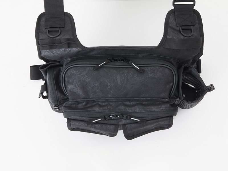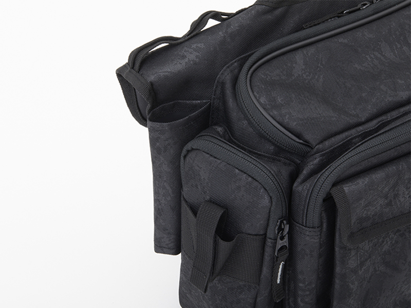 開閉、取り出しの楽なパイピング付き大開口部。メインルームには中型ボックス(26×19cm程度)を2~3個収納可能。小物類を別けて収納できるフロントポケットとサイドポケット付き。ポーチやウエア等が取り付け可能なベルトループを装備。プライヤーホルダー、Dリング付き。水に強いPVC表面生地をバッグ全体に使用(フレンチネイビーP、ブラックPのみ)。針が引っ掛かりにくい樹脂製メッシュを使用したペットボトルホルダー、肩への負担を軽減するパッド付き肩ベルト、バッグのズレを軽減するウエスト補助ベルト、簡易ロッドホルダー付き。