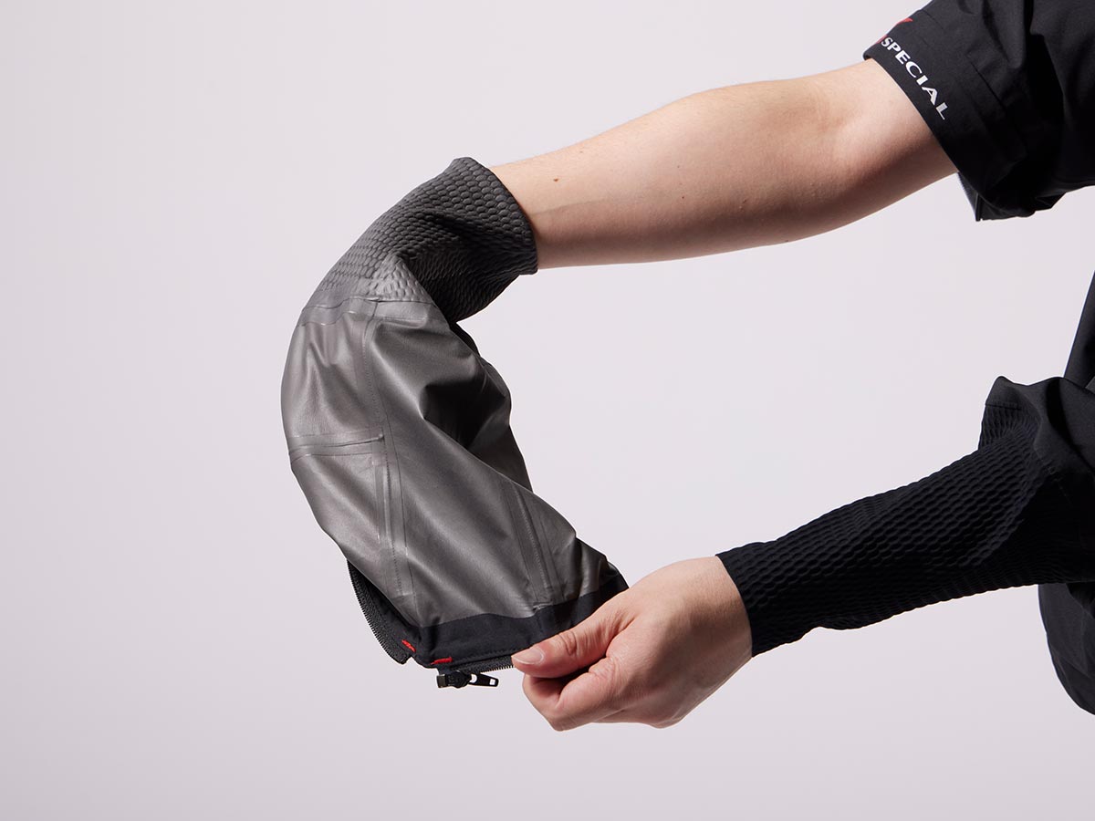 鮎釣りの動作で引っかかりやすい袖口のベルクロを排除しながらも、袖口のフィット感、防水性を向上させた新機構のレインジャケット。立ち込み時にも水に干渉しにくいベリーショート丈。ベストの上からでも着用できる少しワイドな設計。ファスナーで取り外しできる袖構造で蒸し暑い日には半袖レインとして着用可能。高い防水性と透湿性を持ち、裾からの水の吸いあげが起きにくいGORE‑TEX PACLITE® 生地を採用。