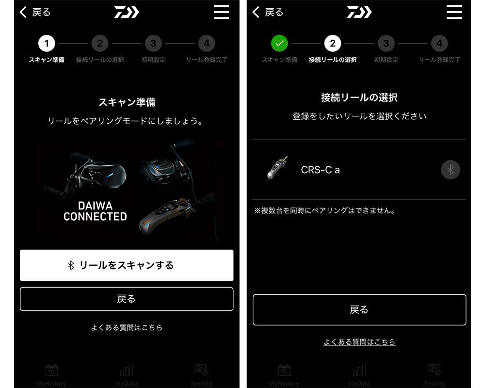 セッティング画面から、「製品登録する」を選択、リールスキャン画面に移行する。この画面でコネクテッドリールをペアリングモードに入れ、リールスキャンを行うだけで簡単に登録することができる。