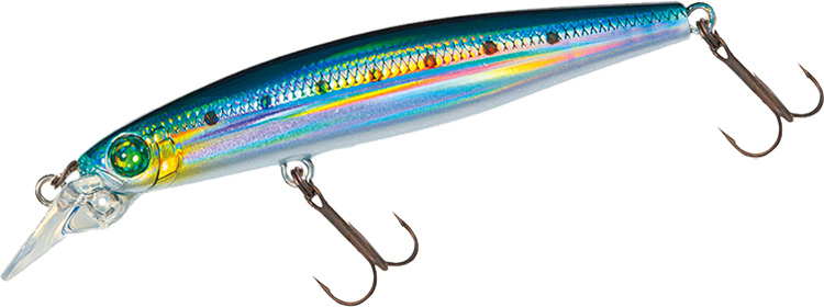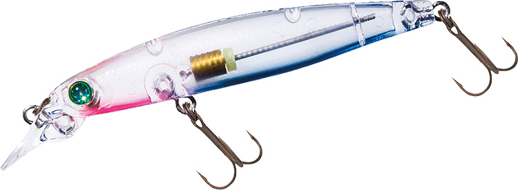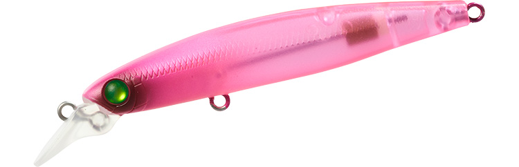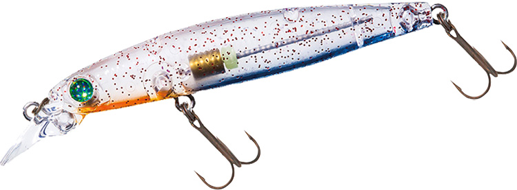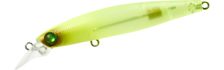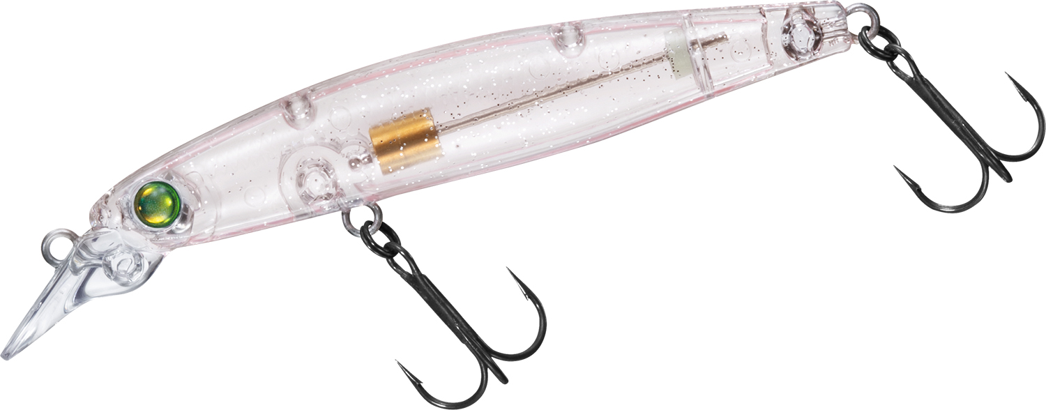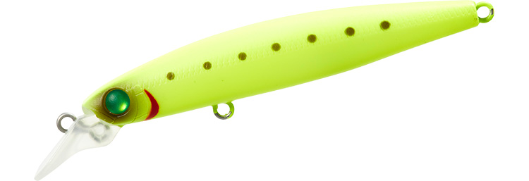 藻場に潜む大型メバルを攻略するために開発されたシャロースリムミノー。通常のミノーでは引くことができないような場所でも攻略できるスーパーシャローランナー。表層のベイトを意識した個体に対して高いアピール力を有する。
