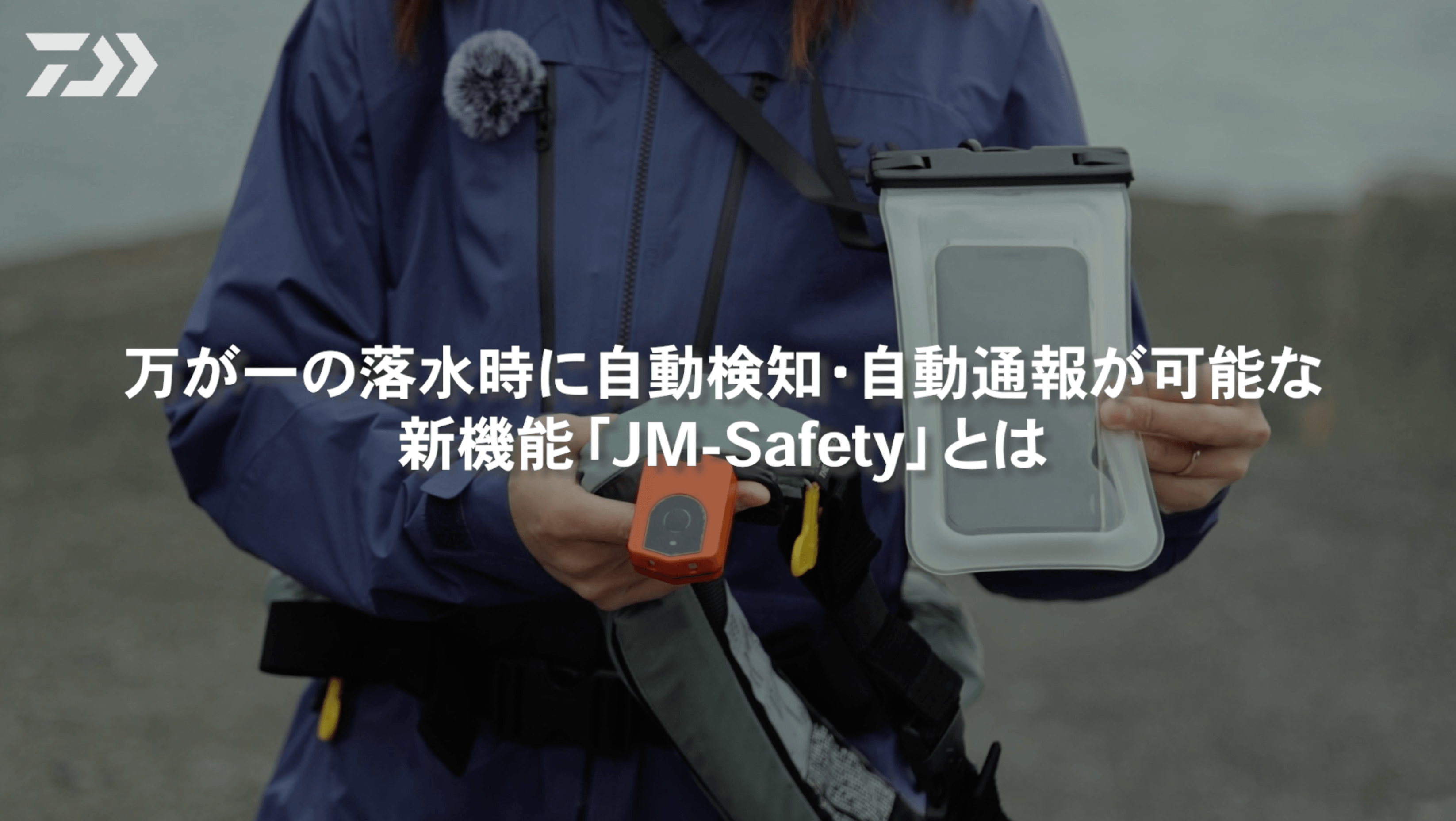 JM-Safetyは、不慮の落水時に自動的に落水を探知し、さらには自動で事前に設定した対象者に通報できる安全機能です。DAIWAでは水辺での不慮の事故に備え、ライフジャケットにJM-Safety機能を搭載することで、落水時の速やかな自動探知・自動通報を可能に致しました。