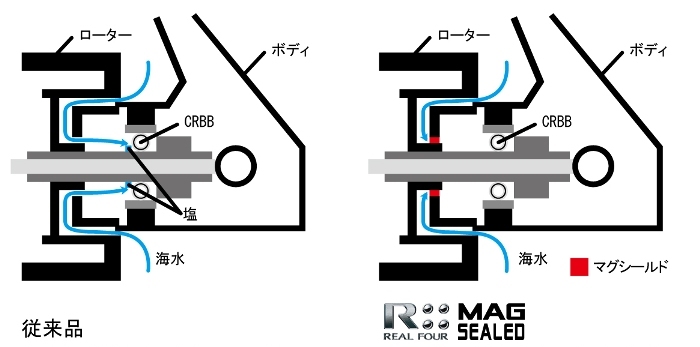 実際の釣りに置き換えて考えてみよう。例えばシーバスフィッシング。特にサーフでのウェーディングゲームでは不意の波被りや、足下のバランスを崩してリールを瞬間的に水没させてしまうこともよくある。干潟や河口部のゲームでも急に深くなったポイントにうっかり足を踏み入れ、リールが瞬間的に浸かることもままあるケース。 想像以上に過酷なのがボートでのゲーム。これはシーバスゲームのみならずオフショアゲーム全般にいえることだが、ベタナギならともかく、波立つ水面を高速で疾走し、ポイントに到着するまでの間に想像以上の波飛沫の洗礼を受ける。 また、意外に潮の影響を受けているのが、港湾部におけるシーバスやエギング、メバリングやアジングに代表されるライトSWゲームである。その手軽さと安全性から、さほどタックルにも負担がかかっていないように思われるが、潮風や細かい波飛沫を受け、知らず知らずのうちに海水がボディ内部に回ってしまっていることが往々にしてあるのだ。 そんな、あらゆる過酷な状況においても、安心して釣りを楽しめるのがマグシールドなのだ。 |