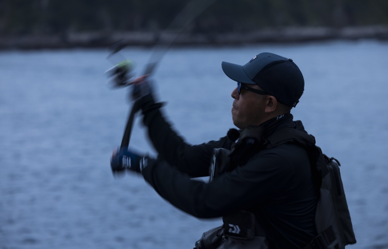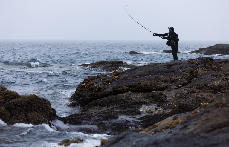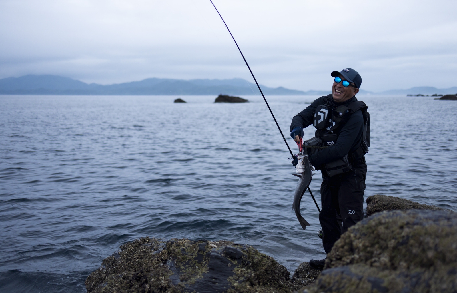 アルミローターが搭載されてフルメタルになったことで、今まで以上に気を遣わず使えることが嬉しいですね。ヒラスズキのように海の荒れた磯場で釣りをする場合、道具よりも自分の安全に気を配る場面が多くなります。ランディングの瞬間、タックルをラフに置いて魚をつかんで波の来ないところまで走るとか……。元々リールは取り扱いに気を遣わなければならない道具ですから、少しでもタフになることは、僕のラフなスタイルには大きなアドバンテージです。実際に使ってみて、まず感じたのは高い負荷のファイト時にも巻き切れる感覚。ヒラスズキでもマルスズキでも、ベイトフィッシュを追っている魚ってゴンッと強いアタリが出た瞬間は勢いのついた状態でアングラーの反対側に頭を向けているものです。その勢いを止めて、こちらに頭を向けて、だーっと巻き切れるパワーは大きなメリットになります。特にヒラスズキは荒い根から出てくる場合が多いので、根から引き剥がせるパワーは獲れる魚を増やしてくれるでしょう。