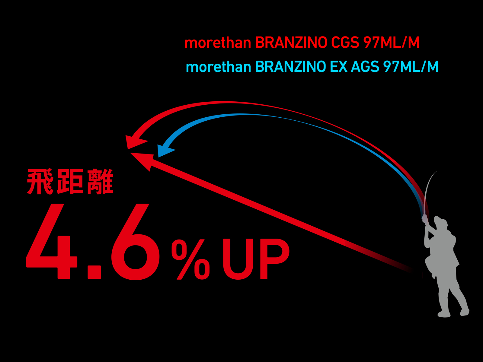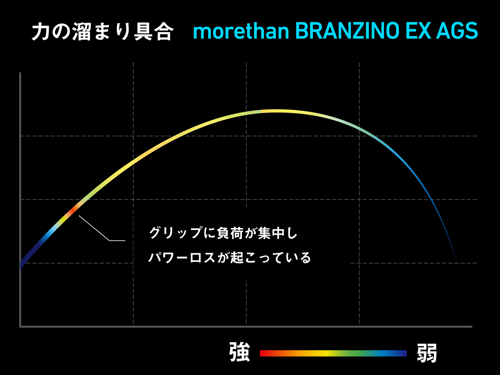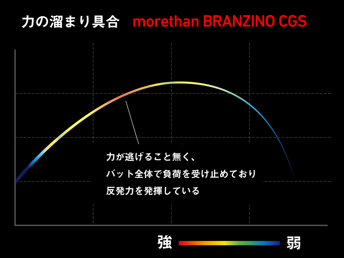 morethan BRANZINO EX AGSと比較すると、グリップ部に極端なパワーの蓄積が無く、パワーをロスしていないことがわかる。バットからベリー全体にパワーが溜まっている。逆並継構造によるバットの細見化と調子の見直しによってバットに最大限のパワーを蓄積することに成功している。この構造が爆発的な反発力を生み、飛距離やファイト性能、フッキング伝達力に繋がっている。