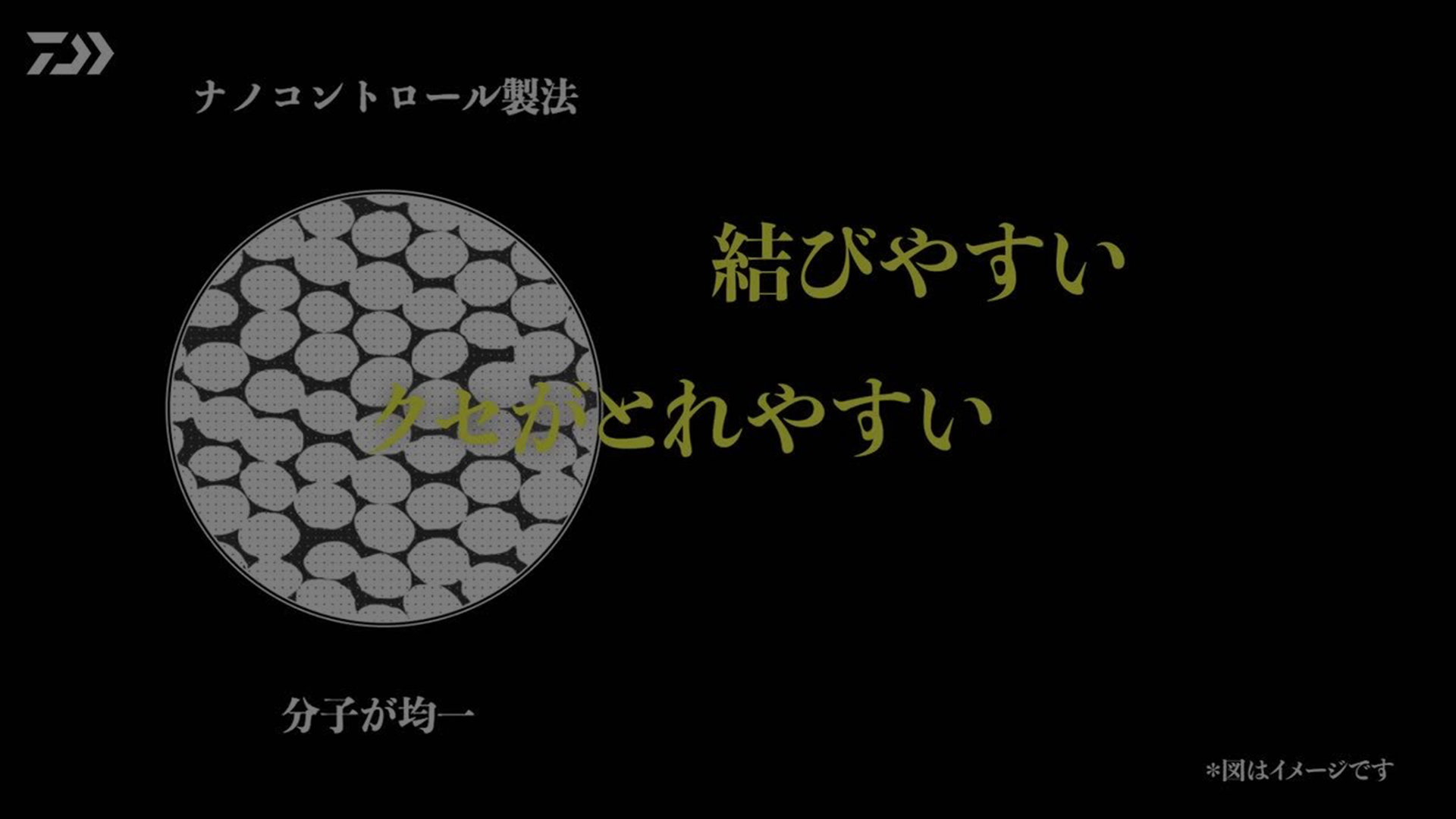 仕上げのテクノロジーとなるのが『NANO CONTROL(ナノコントロール製法)』だ。分子にバラつきや偏りがあると、素材に強い部分と弱い部分が生じ、不安定な性質のフロロラインとなってしまう。そのムラを解消すべく、ナノレベルで分子の密度をコントロールし、均一に分散させることに成功。この『NANO CONTROL(ナノコントロール製法)』によりラインの強さと安定度が飛躍的に向上した。また、付加価値として、結束強度のアップ、糸グセの軽減、初期伸度を抑えた高感度化にも寄与。アングラーの要求に応える最適な状態のラインに仕上げる役割を担う。