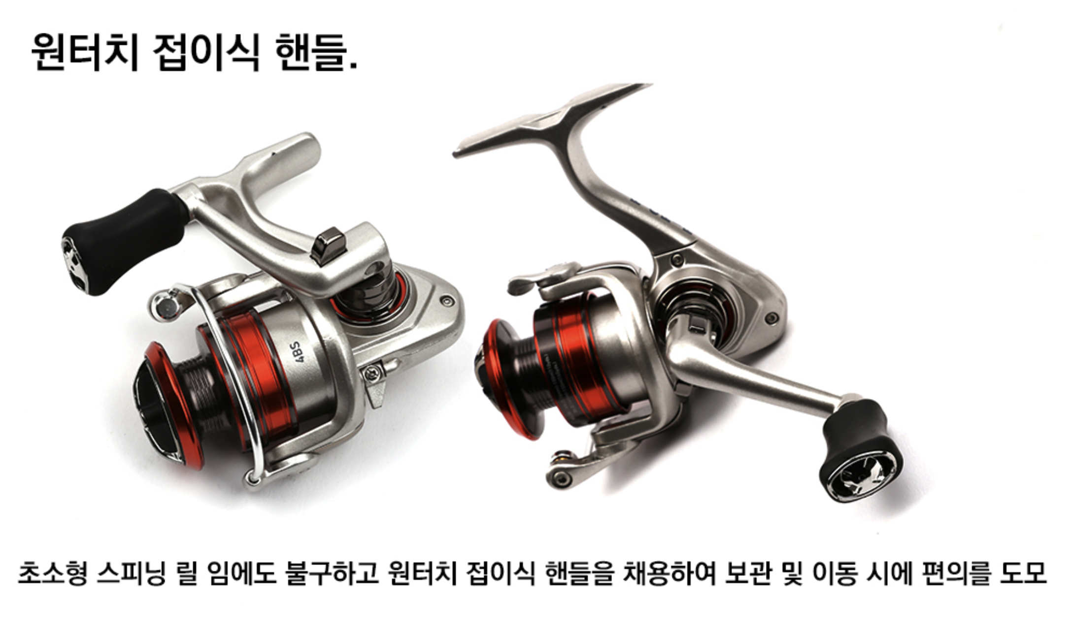 초소형. 스피닝 릴 임에도 불구하고 원터치 접이식 핸들을 채용하여 보관 및 이동 시에 편의를 도모