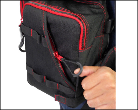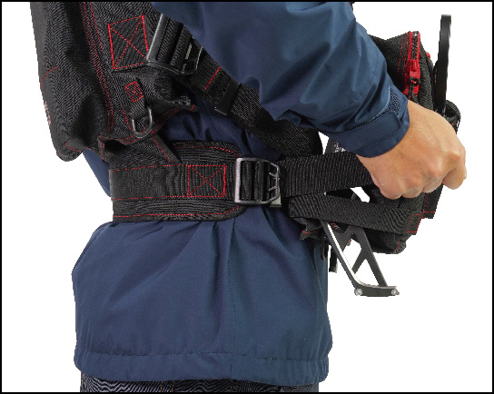벨트를 몸 앞쪽으로 당겨서 착용 상태의 조절이 용이한 사양을 채택했다.