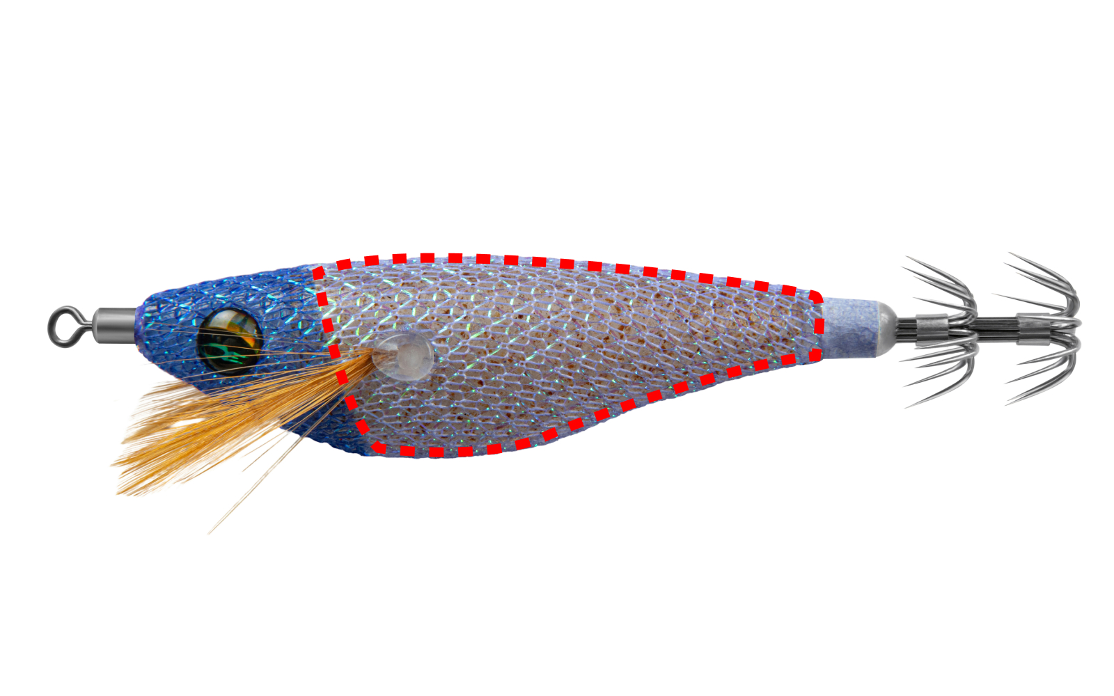 제품의 등 부분에 PVC 소재를 사용하여, 갑오징어가 물었을 때 이물감을 느끼지 않도록 했습니다.