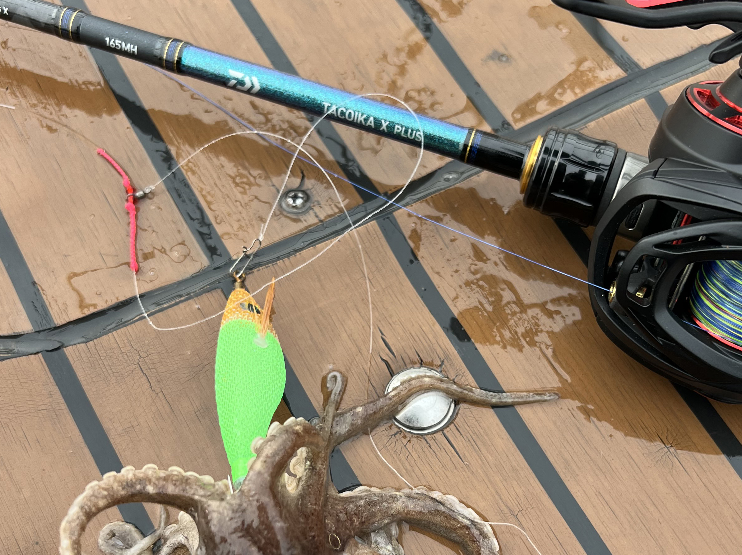 165H | 시즌 초기에서부터 후반의 대형사이즈, 깊은 수심의 고비중 봉돌에 완전 대응하는 진정한 멀티플레이어. 갑오징어 대상으로도 심해 갑오징어 입문기로서 충분한 역할을 고려한 설계는 소재의 특성과 절묘한 밸런스를 구성. 공격적인 스타일에 부합하는 9:1휨새 설정. |