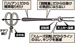 천상 실에 부착하면 회전하는 릴리언이 물속(특히 금속 실)의 꼬임과 꼬임을 방지합니다.