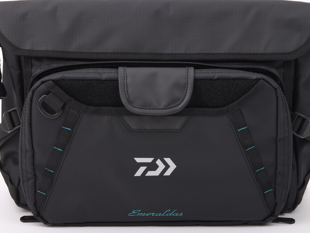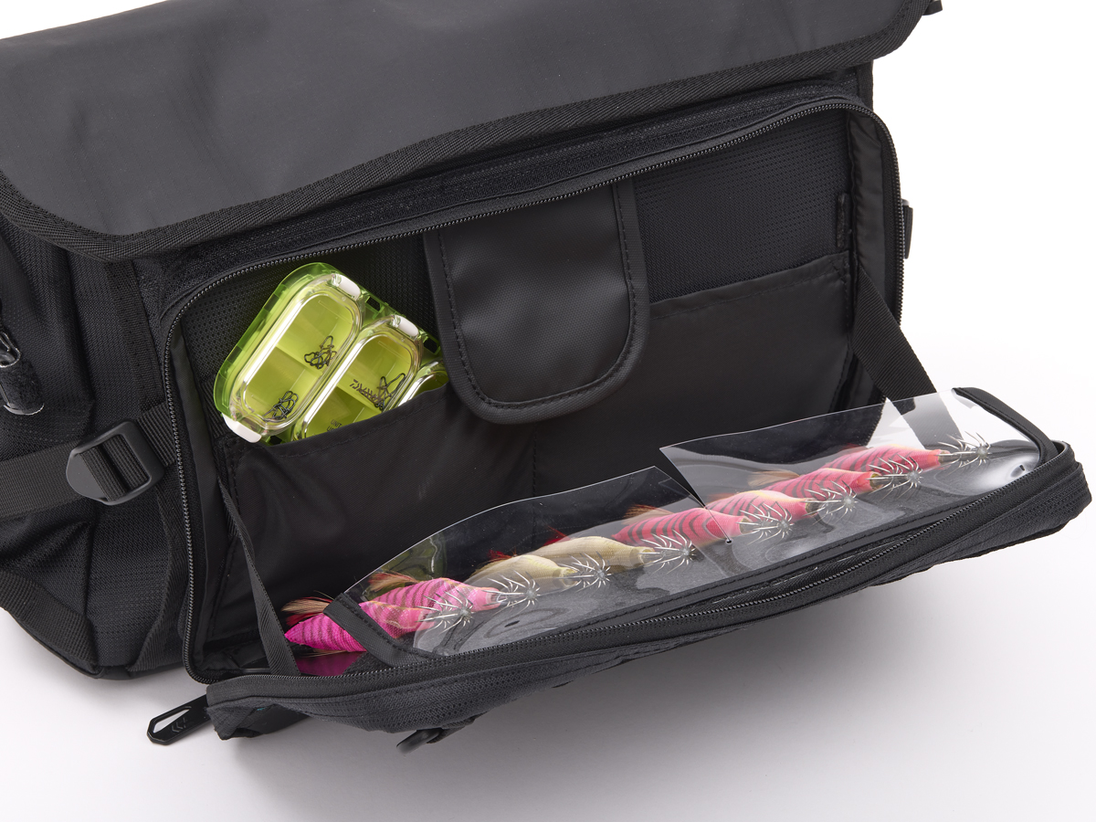 '에기매트가 달린 프론트 포켓'에 교체용 에기를 수납할 수 있어 쉽게 교체할 수 있다!