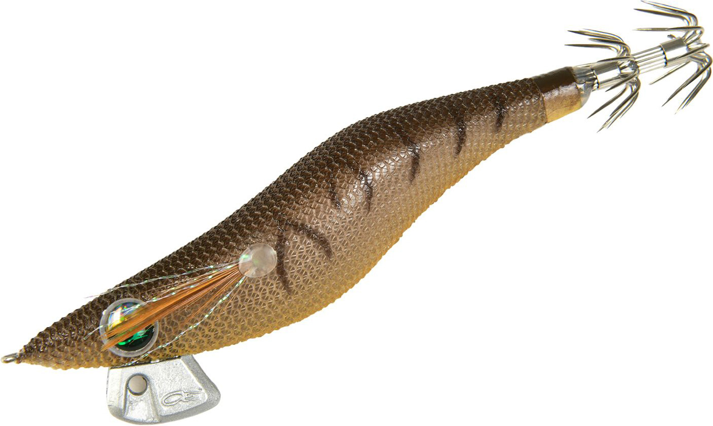 야광 쉬림프 - 브라운 | 네츄럴 컬러로 등쪽은 짙은 브라운 색상으로 시작하여 리얼 새우 무늬를 채용. 야광으로 새벽부터 오후늦게까지 낚시를 하더라도 올라운드로 활용이 가능한 에기. 틴셀의 효과로 보다 대상어종에 어필하여 조과를 책임질 수 있는 에기 타입. |