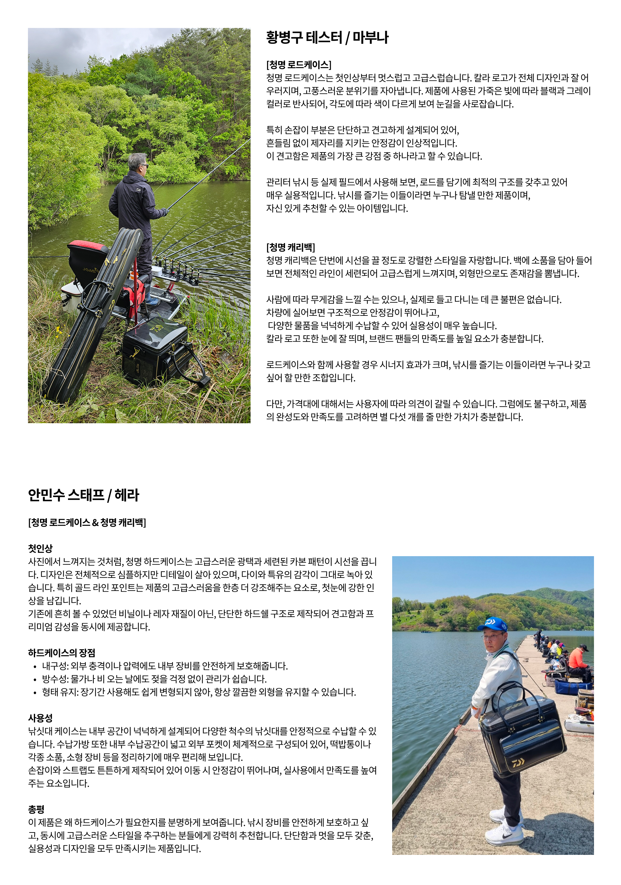 청명 마스터 HD 시리즈는 실전에서 요구되는 내구성과 수납력은 물론, 감성적인 디자인까지 더해져 낚시인의 품격을 한층 높여줍니다.
