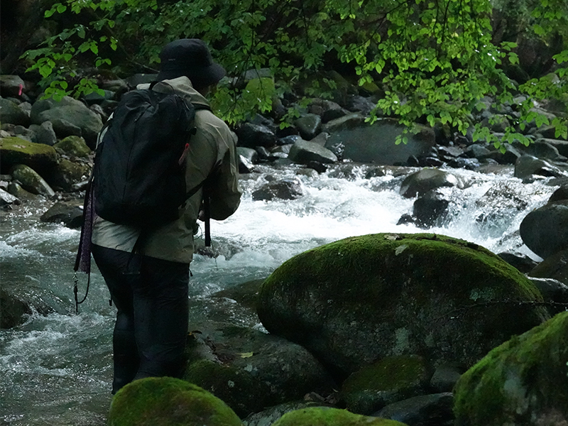 外観は、黒系カラーをベースに、ゴールドのスレッド、文字を採用し、渓流の木漏れ日の中でその存在感を際立たせる。
