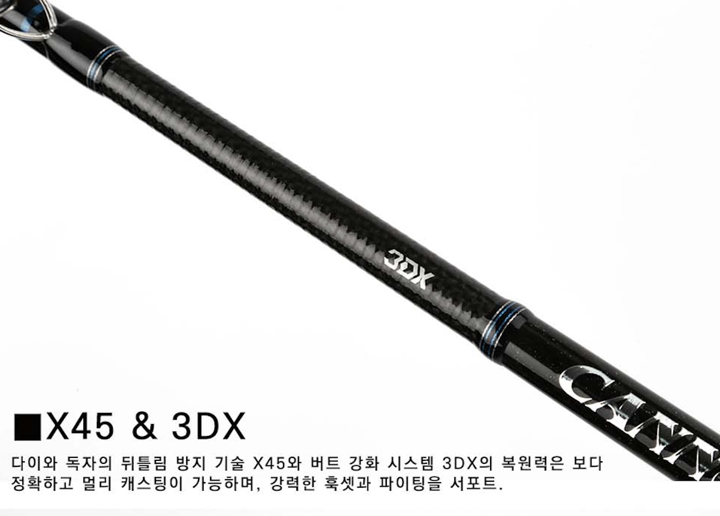 다이와 독자의 뒤틀림 방지 기술 X45와 버트 강화 시스템 3DX의 복원력은 보다 정확하고 멀리 캐스팅이 가능하며, 강력한 훅셋과 파이팅을 서포트.