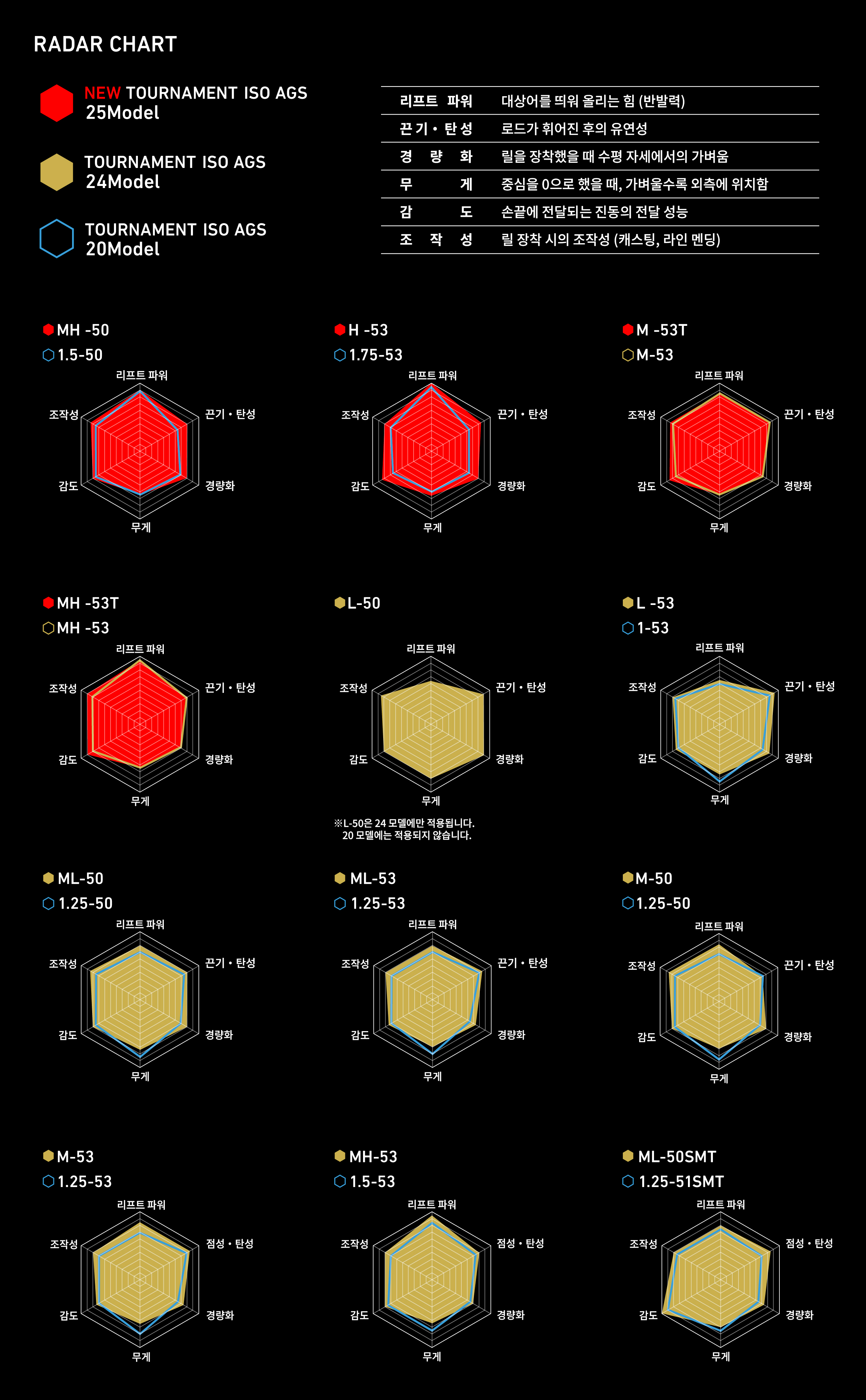 ML-50SMT(1~1.2호 상당) | 탄성이 강하고 조작성을 중시한 기존의 SMT 모델과는 차별화되어, 감도와 유연성을 모두 갖추고 있습니다. 감도를 무기로 다양한 낚시 방법에 대응하며, 30~45cm의 다양한 크기에 대응합니다. 유연성을 부여하여 얇은 목줄로도 강하게 낚을 수 있습니다. 대회 예선부터 결승까지 한 개로 싸울 수 있는 아이템입니다. |