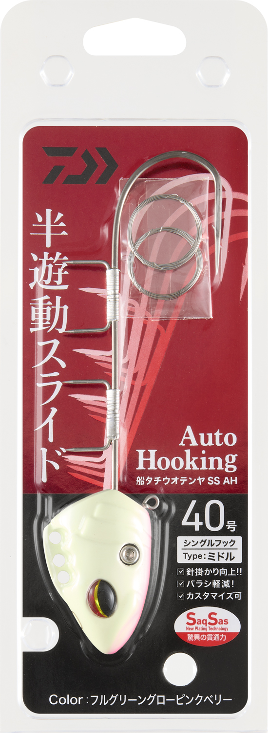 지금까지 없었던 새로운 기능을 탑재. 아래로 당기는 바이트(먹기) 시, 바늘 끝이 미끄러져 바늘이 잘 걸립니다. 바늘이 반유동식이라 갈치의 당기기에 힘을 잘 분산합니다. 바늘 구멍이 커지지 않아 바늘이 빠지는 것을 방지합니다. 헤드와 바늘을 분리할 수 있어 커스터마이징이 가능합니다(분리에는 부속의 육각 렌치를 사용하십시오). 본 제품은 싱글 훅 타입으로 바늘 길이는 미들 타입입니다(※바늘의 구부러진 부분에는 평평하게 가공되어 있습니다). 추 무게 40호 1가지 크기로 7가지 색상이 있으며, 모든 아이템에 사쿠사스 훅이 장착되어 있습니다.