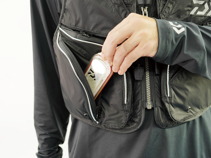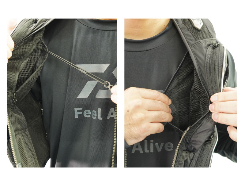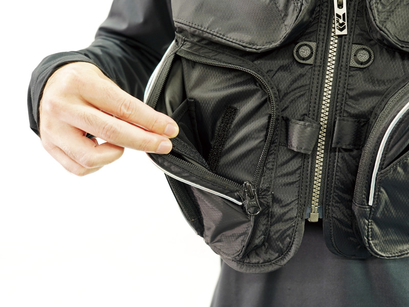 오른쪽 허리에는 '은어 장인 포켓', 왼쪽 가슴 포켓 안에는 '상부 마개 포켓'을 장착.