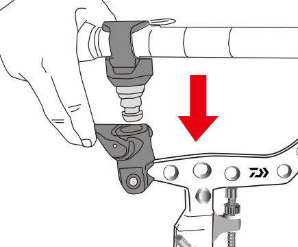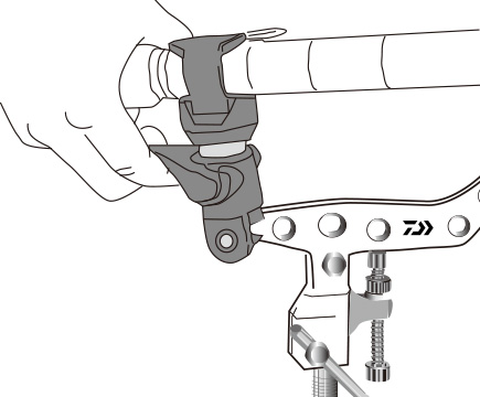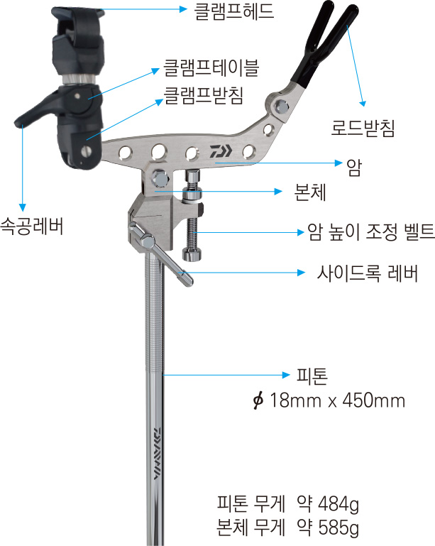 암 조정 다이얼을 사용하여 로드의 각도조정이 가능하며, 클램프 장착 적합 로드는 직경 22.5~27mm의 돌돔 로드 거치가 가능.