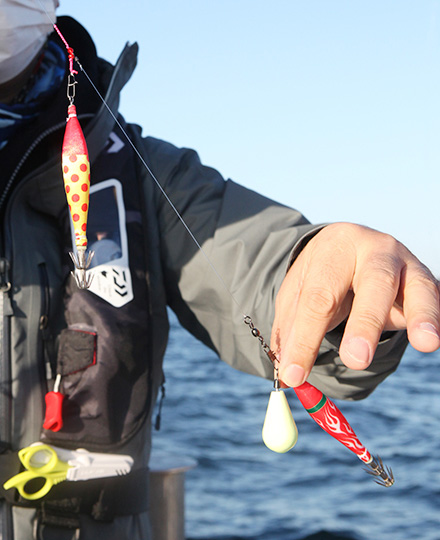 ■ 상단의 유동식 리더에 슷테(에기)를 연결하는 방식과 하부의 봉돌 연결 부에 싱커과 슷테(에기)를 같이 연결하면 상하로 갑오징어와 주꾸미를 동시에 노리는 2단 채비로 활용이 가능.