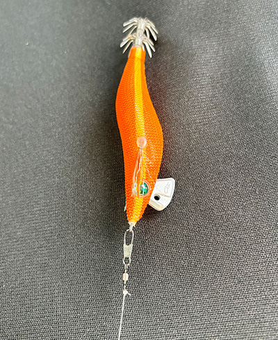 슷테(에기)의 연결 부 리더를 최대한 짧게 연결한 모습과 상, 하부 동시에 슷테(에기)를 달아 상부에 갑오징어, 하부에는 주꾸미를 동시에 노리는 2단 채비로 운영하는 경우.