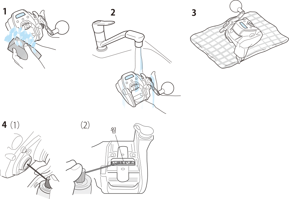 | ・ | 릴 본체에 상처가 날 수 있으므로 가루세제, 브러시, 와이어 브러시 등을 절대 사용하지 마십시오. |